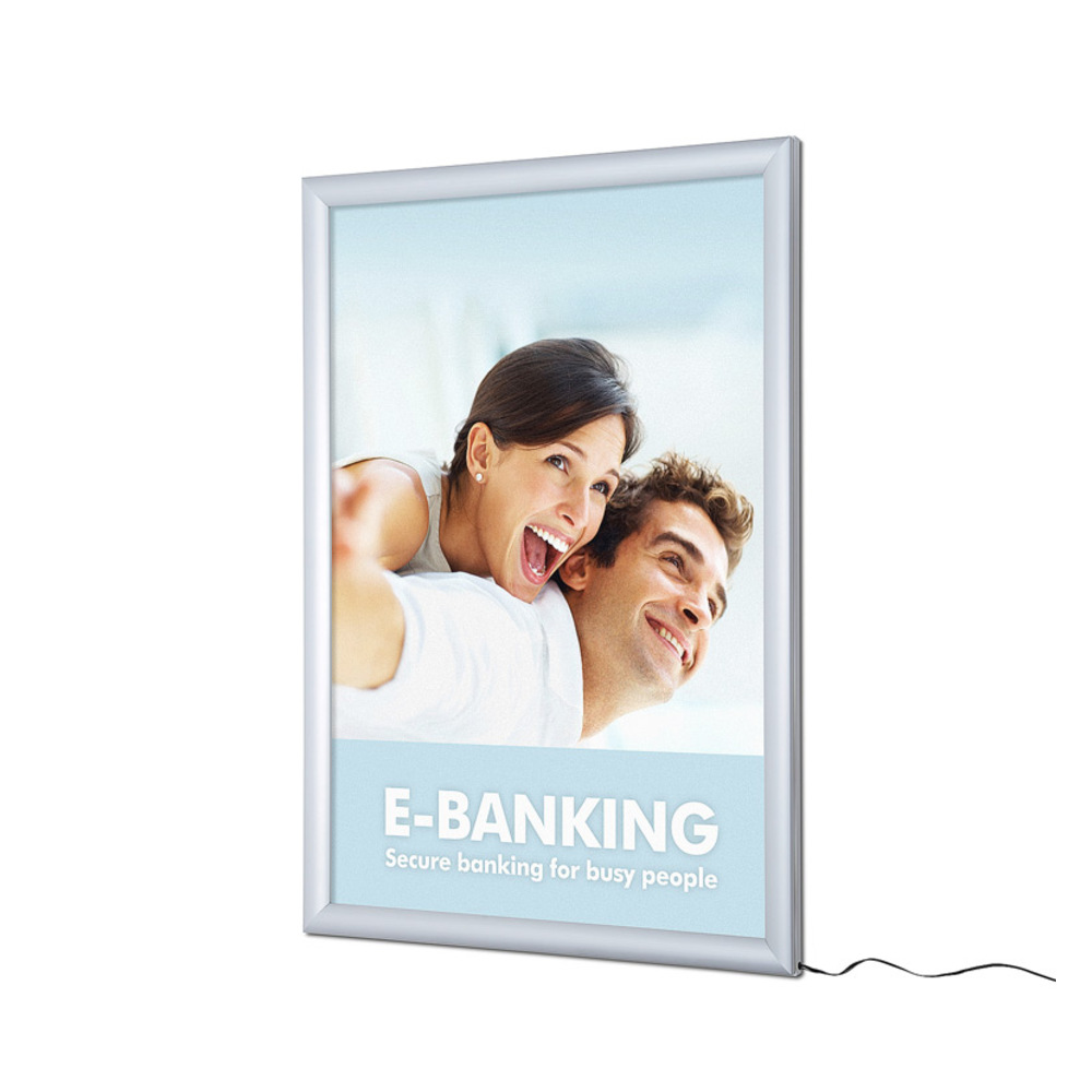 A stunning eye-catching illuminated poster frame to let your poster shine bright! The LED Poster Light Box is a high quality ultra-thin design LED light box, with proven snap frame techniques for easy poster exchange. Bright and homogenous illumination thanks to the opal laser glass backwall, with edge lit 12V LED lamps will let your poster shine bright. An elegant look and daylight colour temperature (5000K). Ideal for shop window presentations. Available in different sizes. Suitable for wall mounting with a single-sided print and hanging with a double-sided print. Highlight your poster with the LED Poster Light Box!