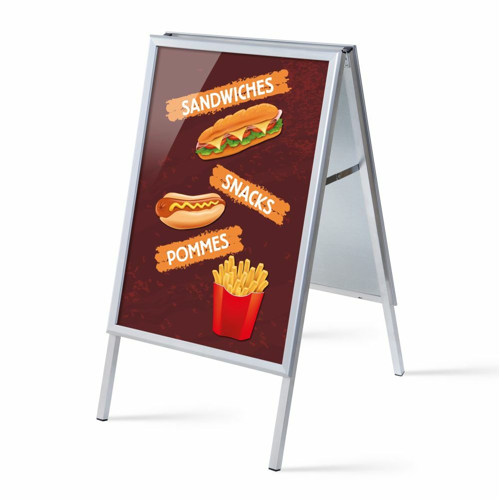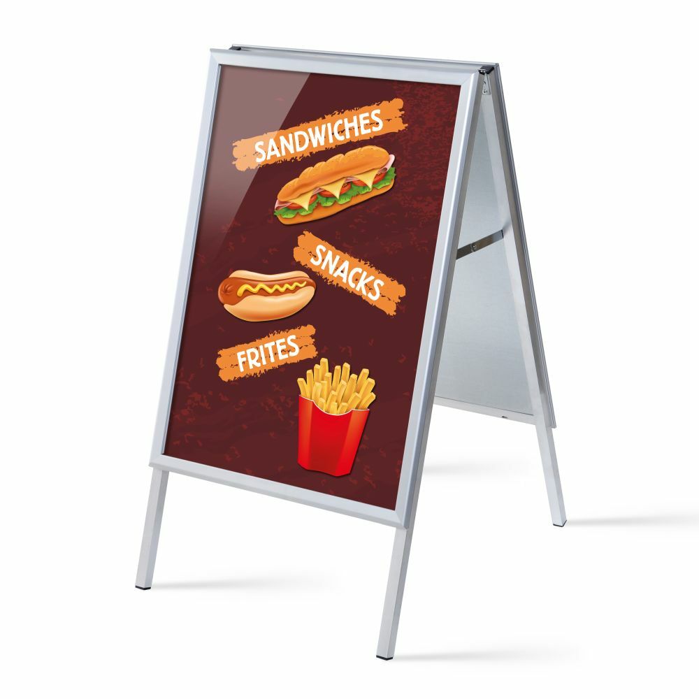A popular A-board that fits in every situation; from shopping centers, covered public spaces, to the hospitality sector or at events. The aluminium A-board is a great pavement sign for double-sided advertisement and has a 32 mm thick profile with mitred corners. An excellent way to attract passing traffic. Choose the standard print design that suits your occasion. Available in A1 format.