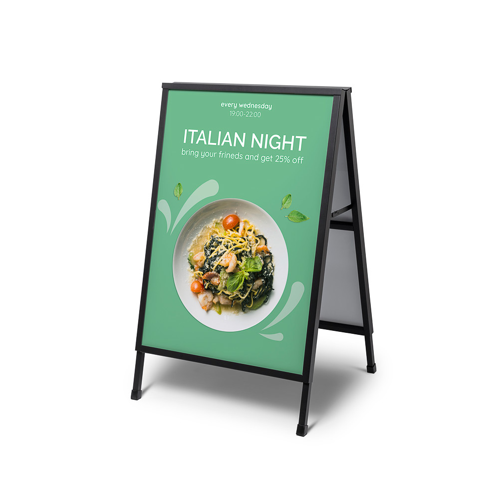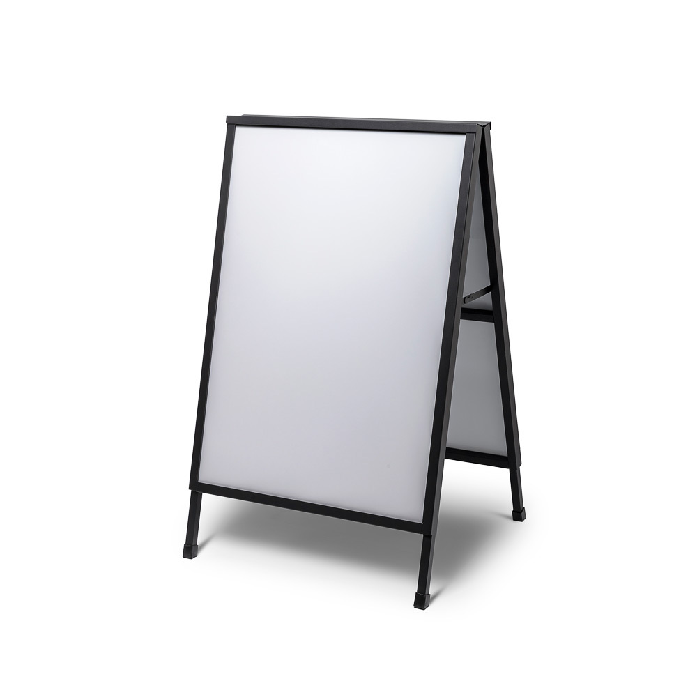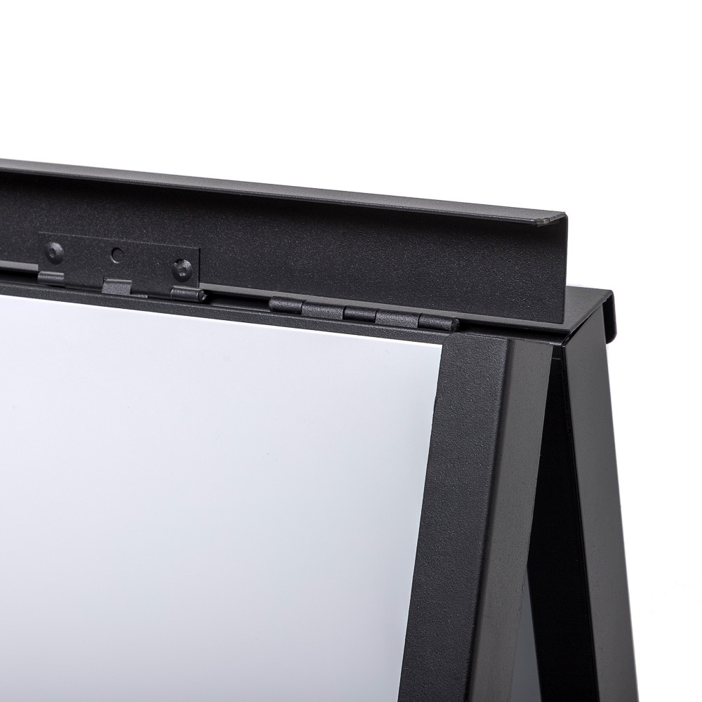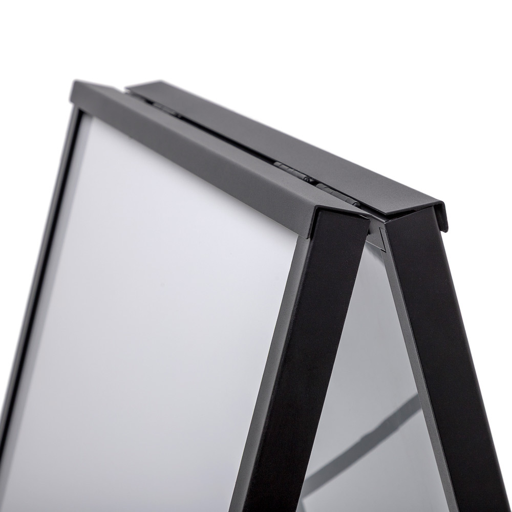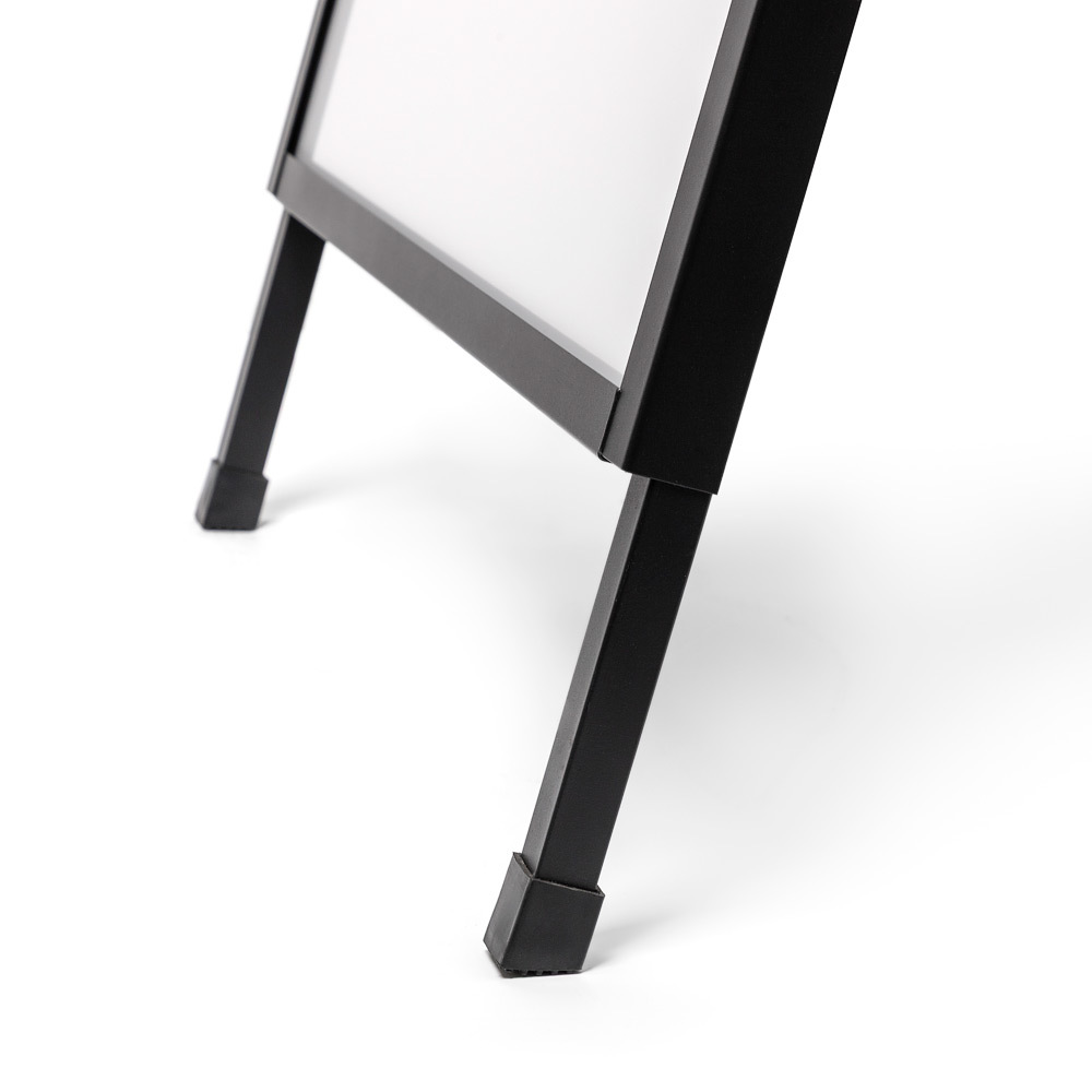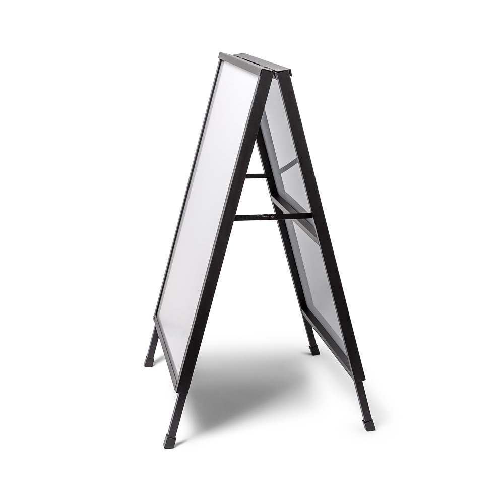 Promote your message or brand with confidence using the weather-resistant A-Board Slide In. Designed for long-term promotions, its sleek black steel frame ensures lasting stability. Suitable for the best-selling A1 size and offering double-sided display. It maximises visibility from every angle! Updating content is a breeze: simply open the frame at the top and slide the board into place . The perfect solution for eye-catching outdoor promotions across retail, hospitality, and urban spaces.