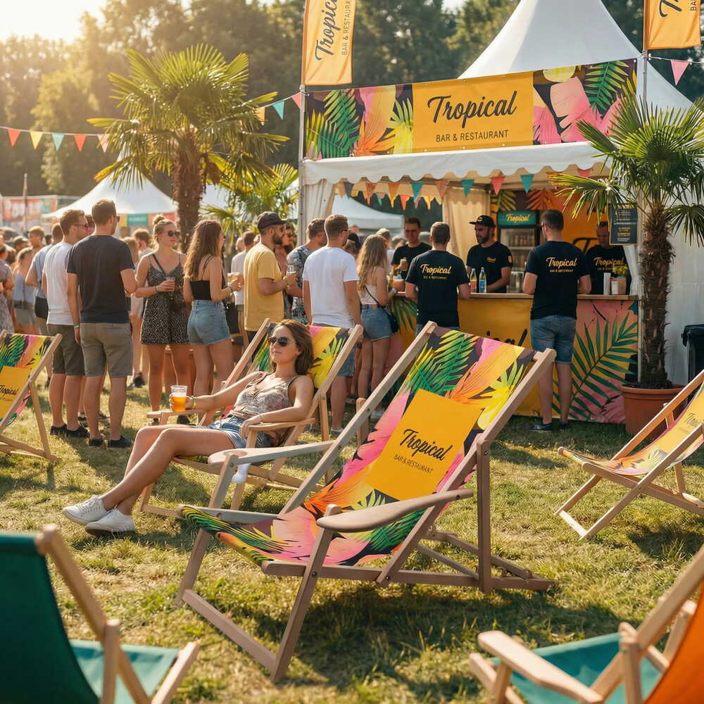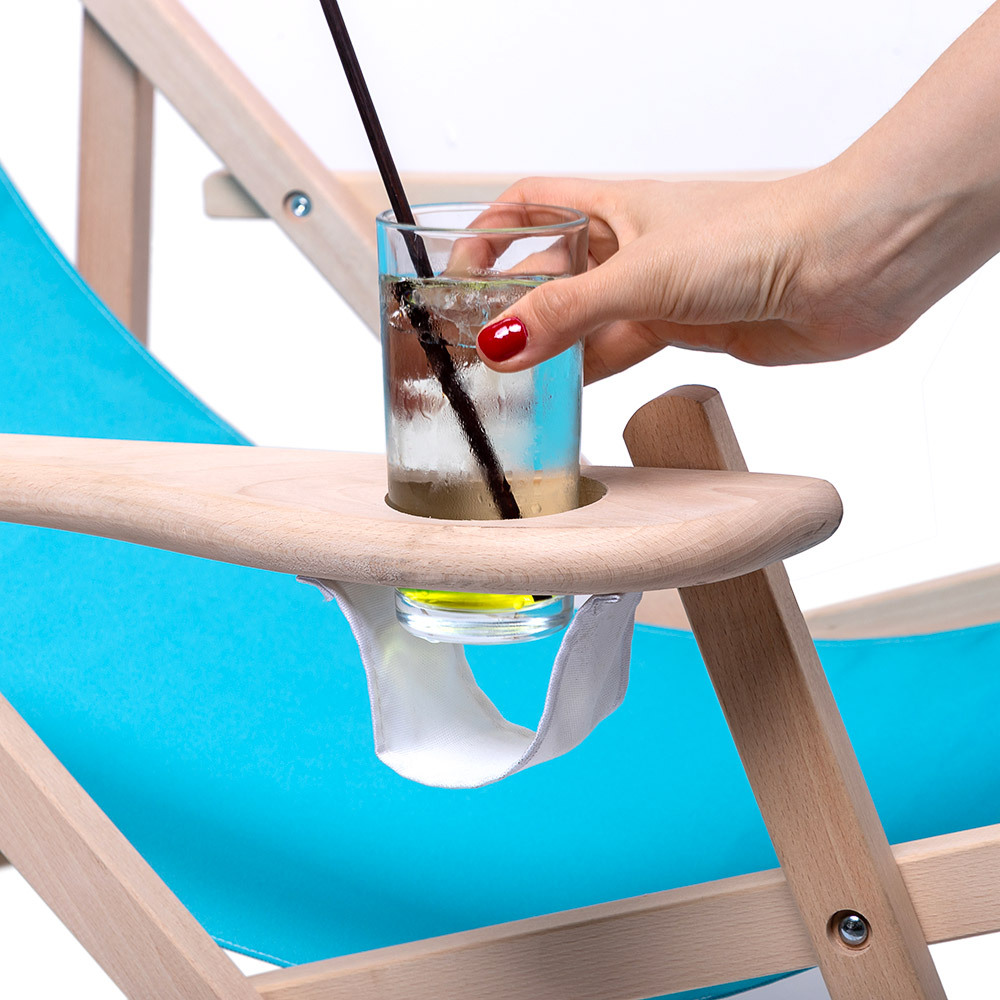 Enjoy branded comfort that stands out! The Beach Chair Relax Comfort combines a sturdy beech wood frame and convenient armrest with a built-in beverage holder — ensuring your is drink always within reach. Featuring three recline positions, a sanded finish free of sharp edges, and safeguards to prevent accidental folding, it’s perfect for terraces, events, or chill-out zones. The self-change fabric system makes updates easy — just slide the wooden fixing bar into the fabric sleeve, wrap it over the frame, and secure it in place. Add an optional back banner for even more promotional space!
