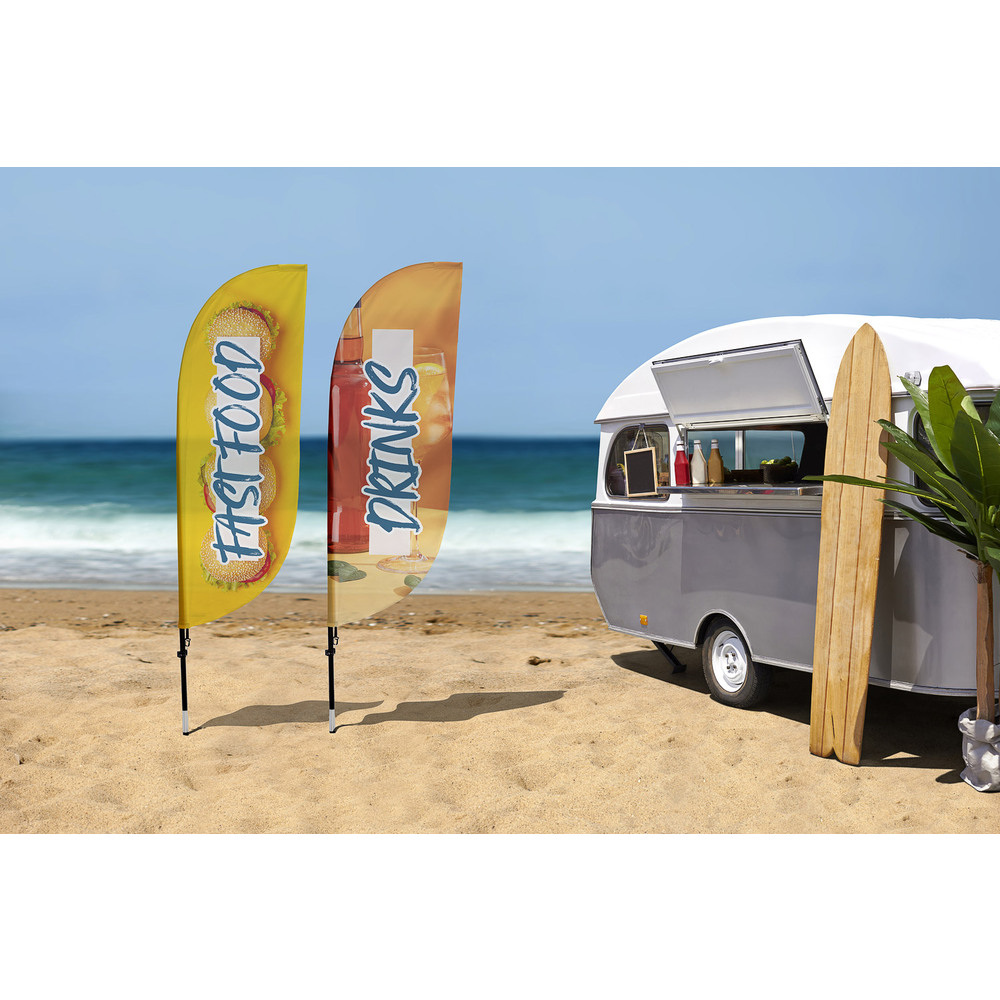 The Beach Flags are printed dye sublimation direct print. This means that the printer directly prints on the fabric, and after it the ink sublimated into the fibers in the heat press. An advantage of the direct sublimation print is that 80% of the print transfers onto the other side of the fabric, which is the best proportion for single-sided flags.