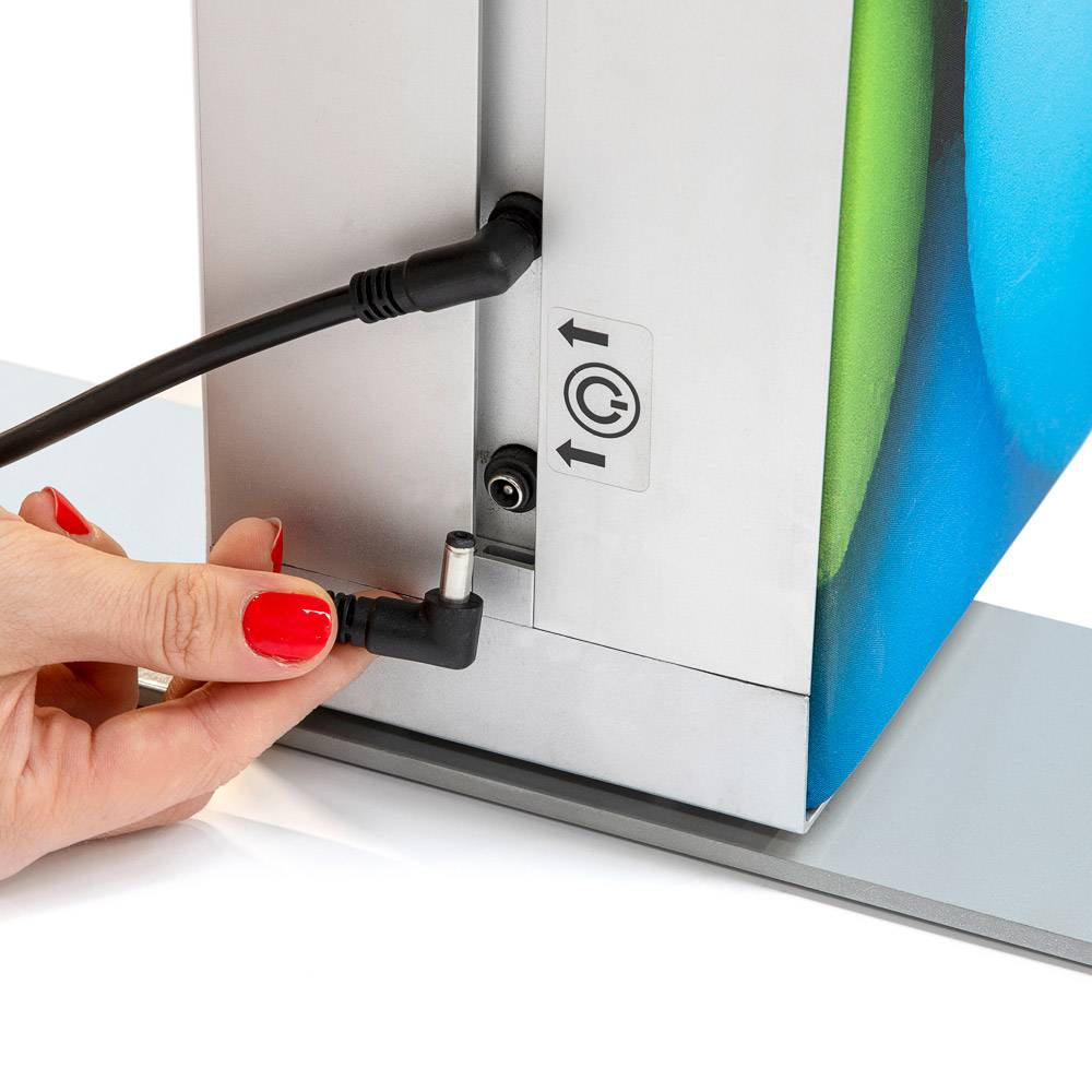 The LED lights are centrally placed inside; the transformer and cable are attached to the side