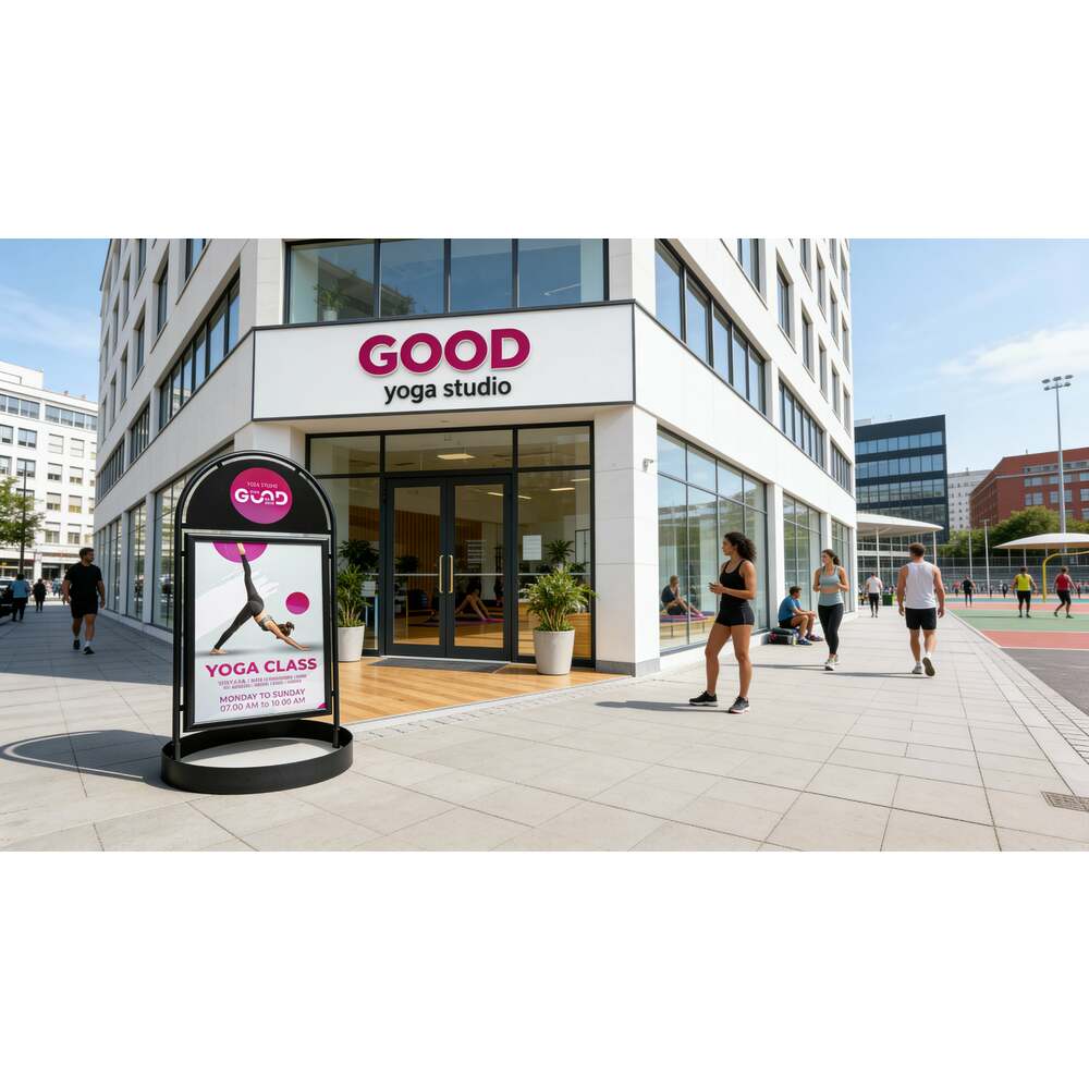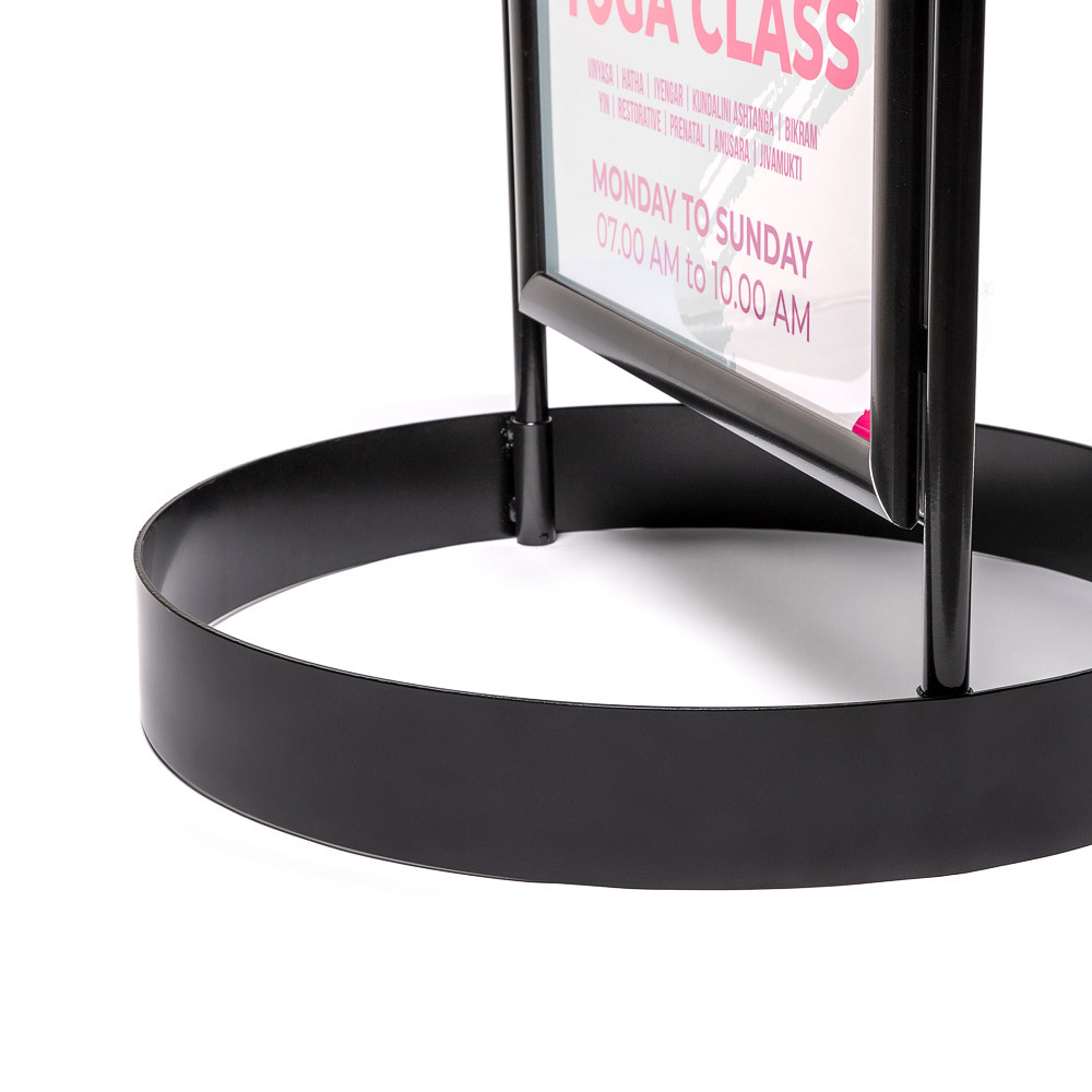 Boost your street presence with the City Sign Elegant Steel. Its circular steel base ensures sidewalk safety, while the powder-coated frame withstands all weather conditions. Display your messages on both sides and highlight your branding at the rounded top. Durable, stylish, and perfect for urban environments!