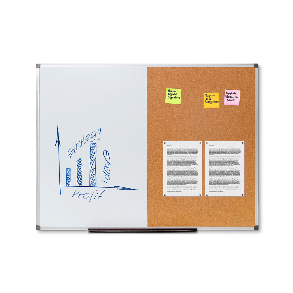 The Combi Board - Alu Whiteboard / Cork is perfect to use in offices or schools. Write down your to do list of the day with chalkmarkers or hang fun and nice team achievement pictures in your canteen.