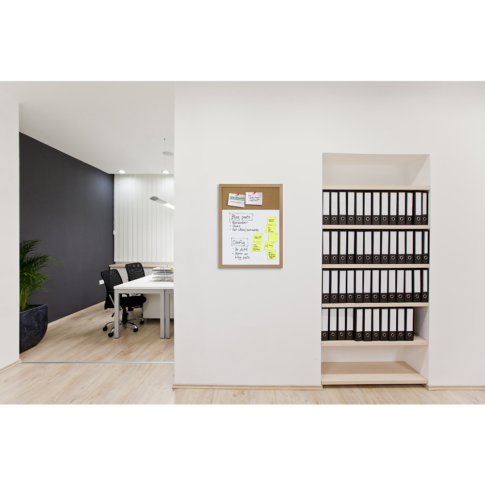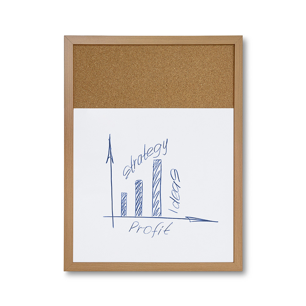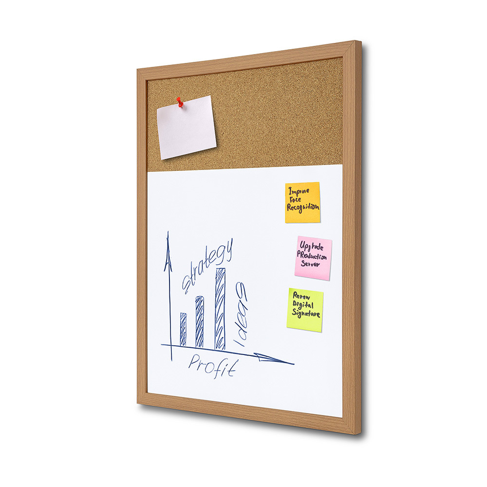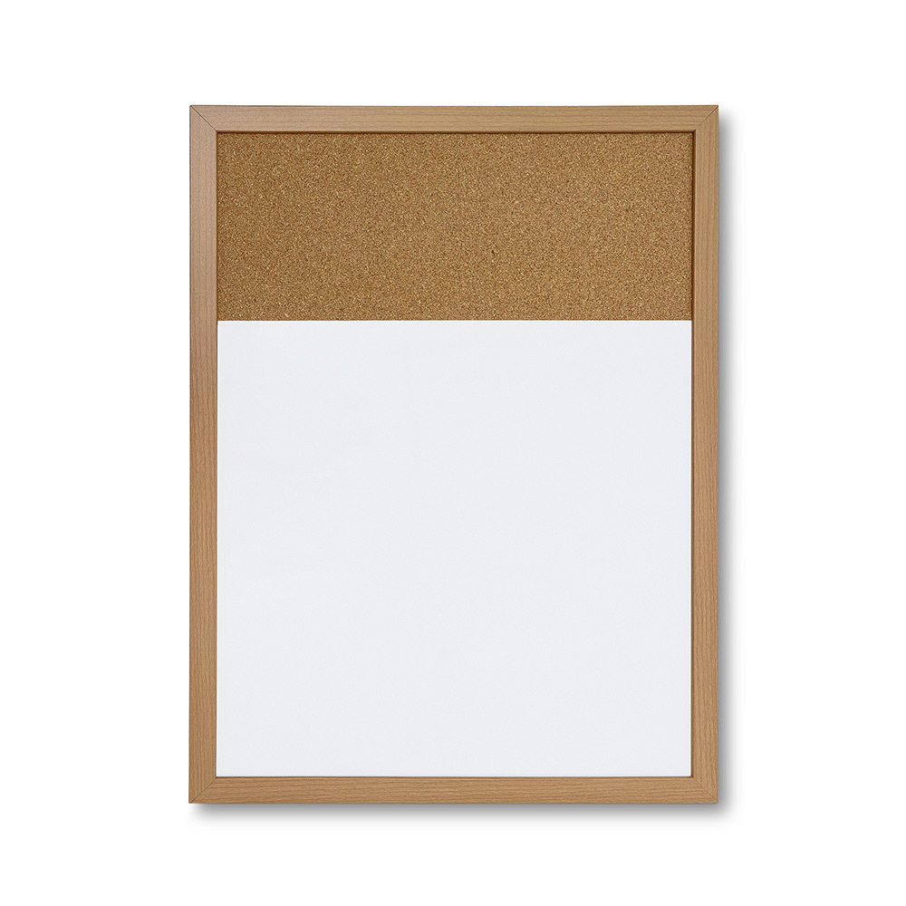 The Combi Board - Wooden Whiteboard / Cork has a refreshin appearance design thanks to the light woorden frame, whiteboard and cork surface combination. On the dry wipe surface you can write your messages with chalkmarkers and on the cork strip you can pin your notes. The Combi Board - Wooden Whiteboard / Cork is available in two sizes 45 x 60 and 60 x 90 cm and with ready to hang fixings on the backside.