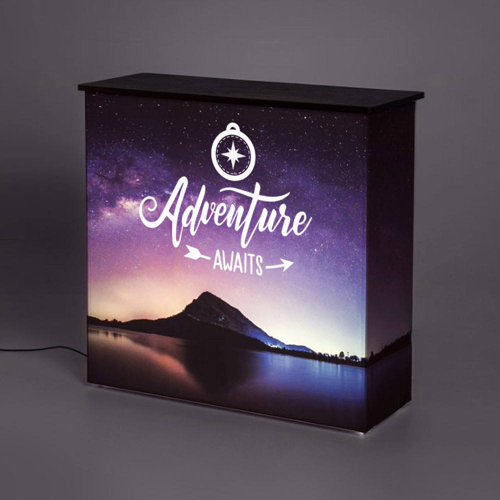 Step into the spotlight with the Counter Impress. Designed for quick setup, its collapsible aluminium frame delivers striking visuals with an silicone edge graphic. Choose the illuminated version with optional LED curtains and Lumina graphic, or keep it classic with a Soft Knit graphic. Sleek in design and sturdy enough to hold up to 55 kg, it pairs seamlessly with the Pop-up Impress. Pack it into the soft carry bag and impress wherever you go!