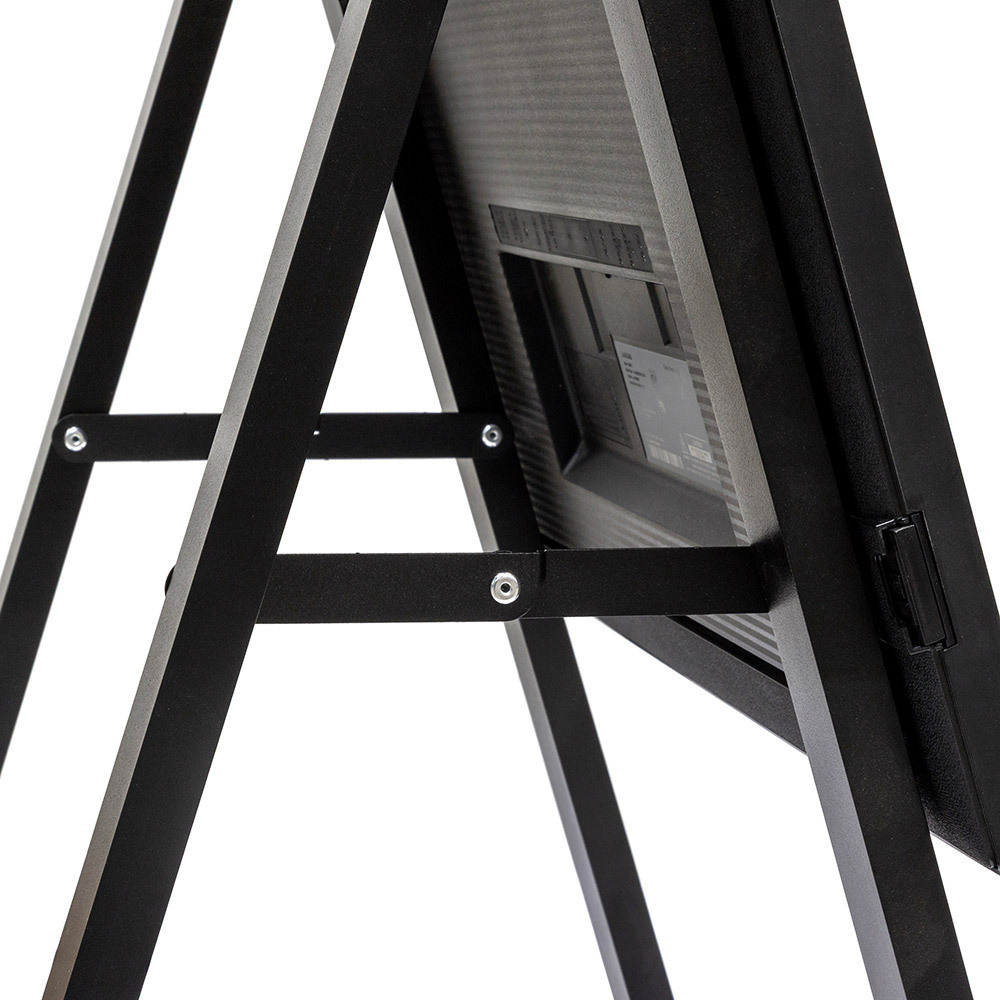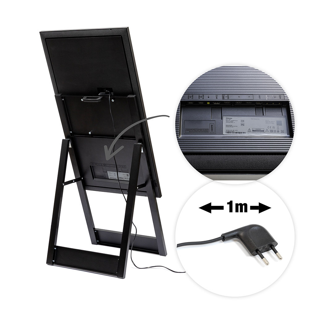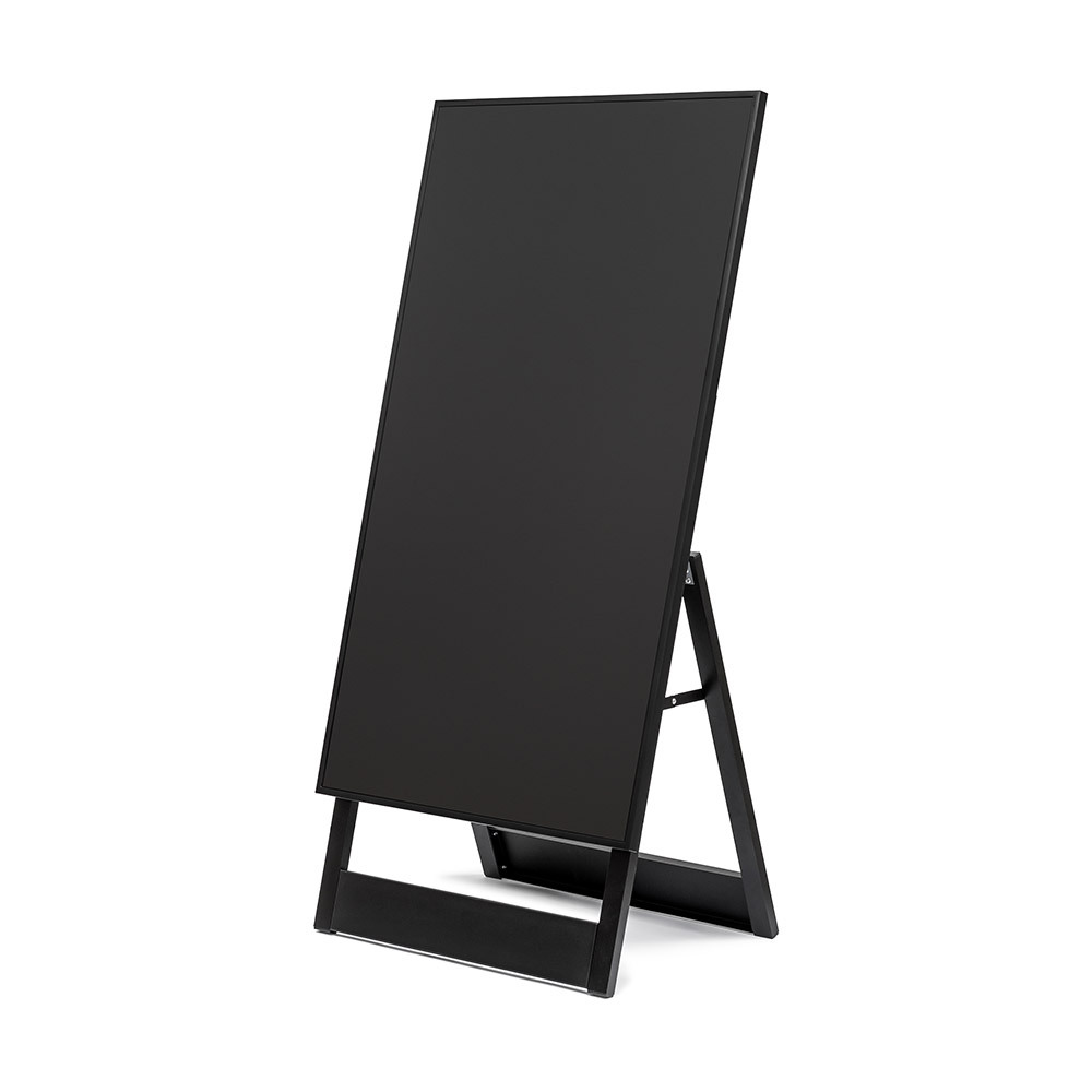 Present your digital content with the Digital A-Board Easel. Featuring a slim 40 (W) x 20 (D) mm black aluminium frame with steel components, it offers a modern, stable design. Freestanding, easy to assemble and flexible placement. The VESA-compatible mount supports 43" or 55" Samsung QMC screens. Plug&play your content 24/7 via USB, or upgrade to the full experience with Samsung VXT CMS!
