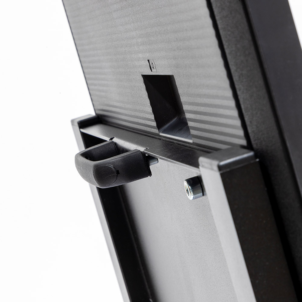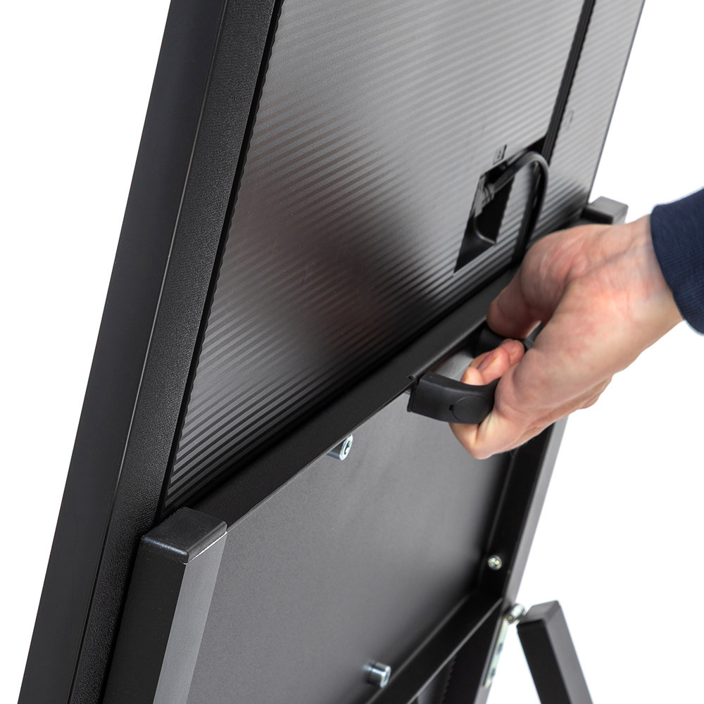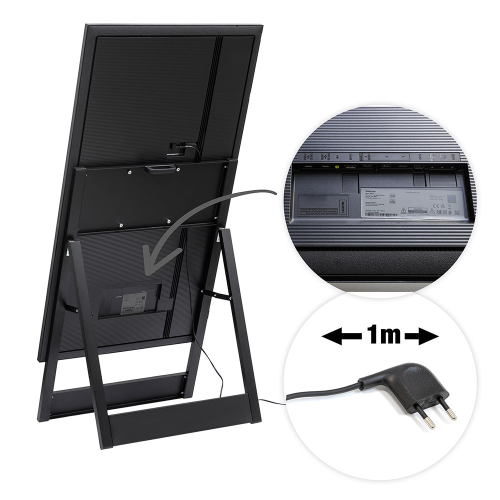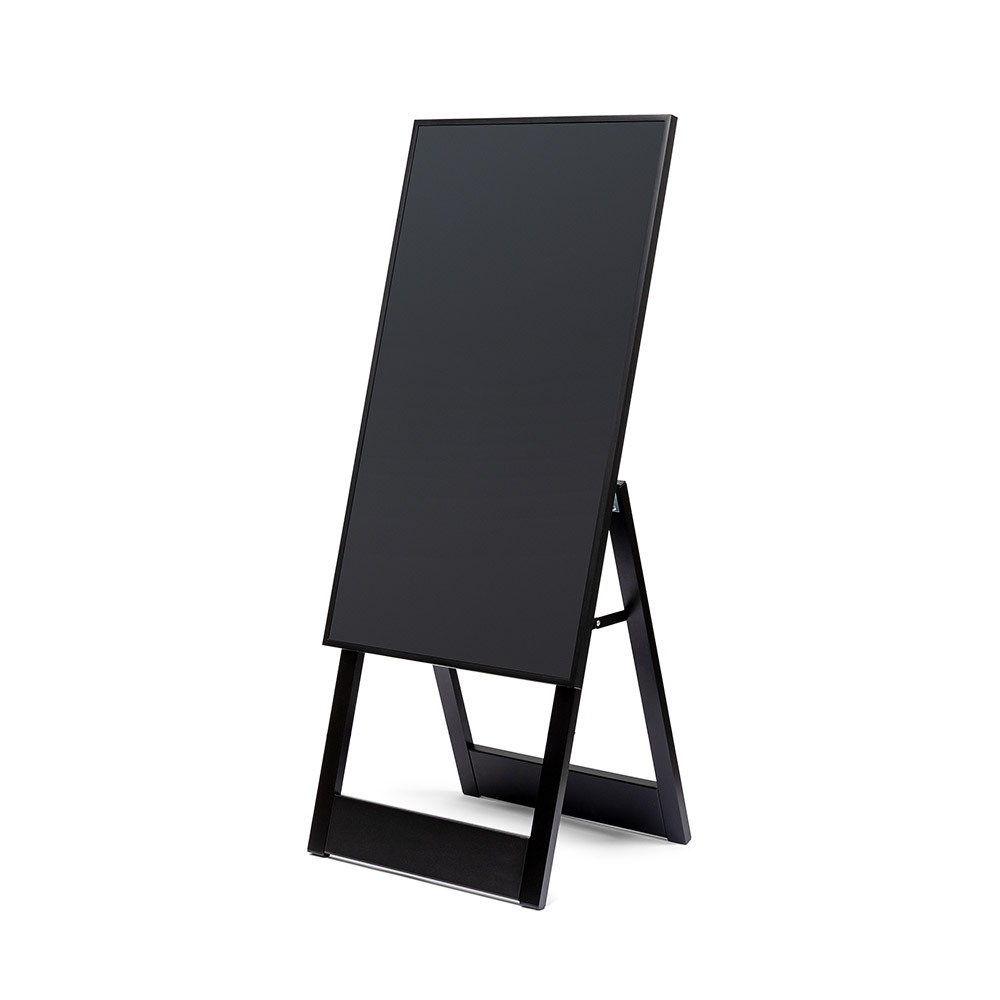 Present your digital content with the Digital A-Board Easel. Featuring a slim 40 (W) x 20 (D) mm black aluminium frame with steel components, it offers a modern, stable design. Freestanding, easy to assemble and flexible placement. The VESA-compatible mount supports 43" or 55" Samsung QMC screens. Plug&play your content 24/7 via USB, or upgrade to the full experience with Samsung VXT CMS!