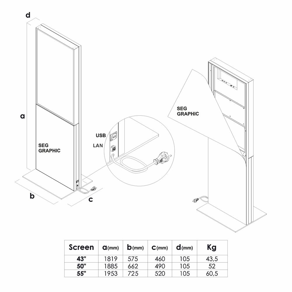 Empower your message with the Digital Fabric Totem. Show a video message on the screen and display your logo or company branding with a printed tension fabric on front below the screen and with an full graphic on the back. Due to the fabric you can customise your totem and change the messages frequently. Add a seasonal or promotional theme to the totem with a SEG fabric graphic and change it whenever you want.