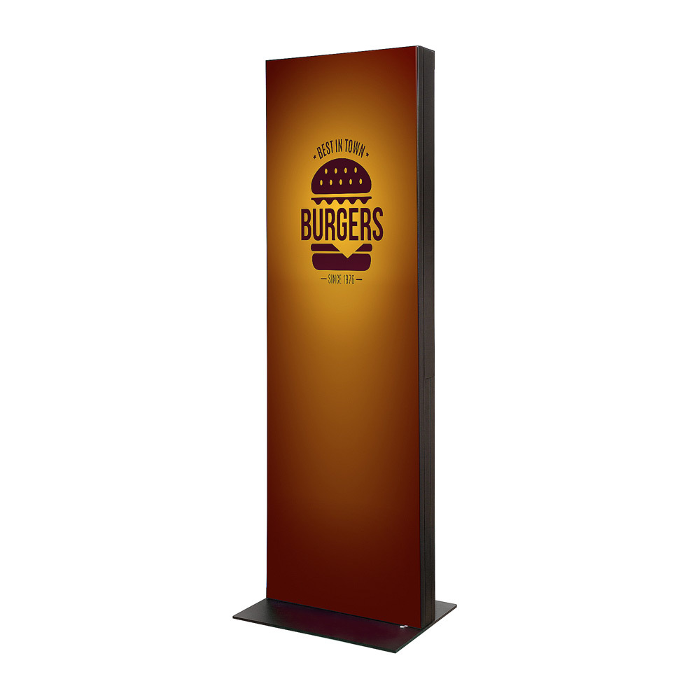 The digital totem comes with a great print quality dye sublimation tension fabric to the lower front part of the totem and the full back. The totem is available in sizes 43”, 50” and 55”. The standard housing is available in the colour black but other RAL colours are possible on request. The digital fabric totem can only be used indoors. Ask your sales person for more information.
