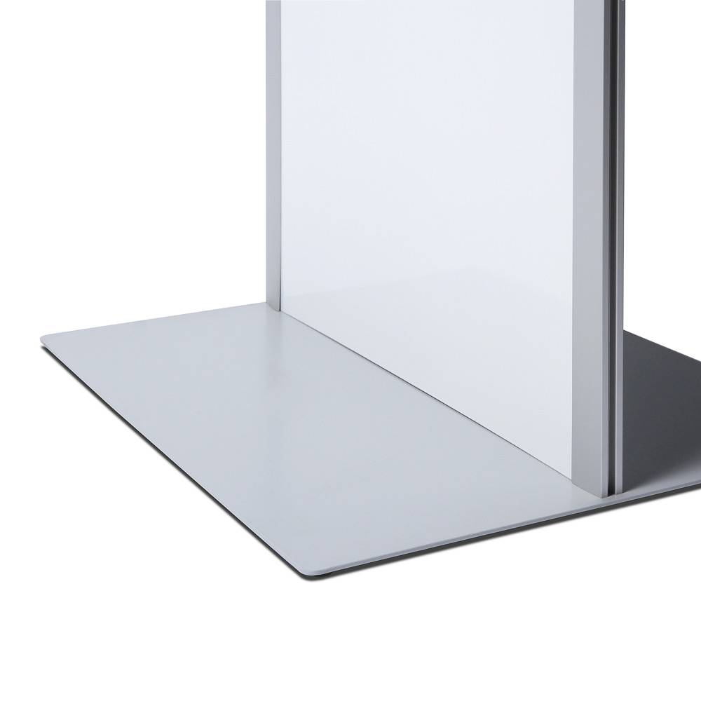 A multifunctional brochure totem, that makes sure that nobody will miss your informative literature! The Brochure Rack Totem is a freestanding pillar, that offers combination options of the acrylic pockets and snap frames. A modern design, with silver anodised aluminium edge profiles and with a white powder coated central panel optimal for logo branding. Choose what sizes of brochures you would like to use and how many leaflet combinations you want. From a wide totem, to a small one, or a totem with a poster. With the Brochure Rack Totem there are enough possibilities to choose from!