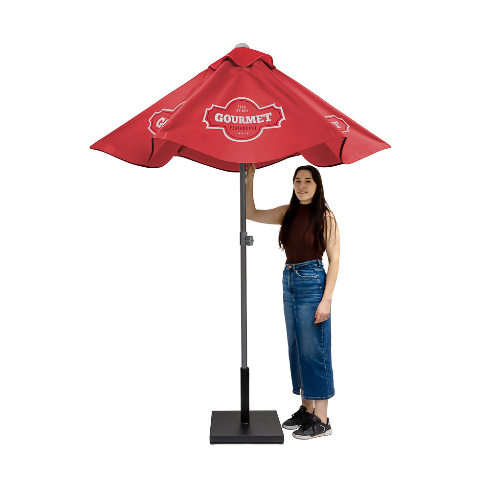 Strong and stylish, the Horeca Umbrella Slide delivers reliable shade with its modern grey aluminium frame and water-resistant canopy. The easy grip handle allows for effortless folding and unfolding, while the sturdy steel base or water tank secure stability. The full-colour graphic ensures visibility from a distance, while pockets keep it securely fiited to the umbrella. Our umbrella stands up to all weather conditions, making it perfect for terraces, outdoor venues, gardens or any outdoor setting.