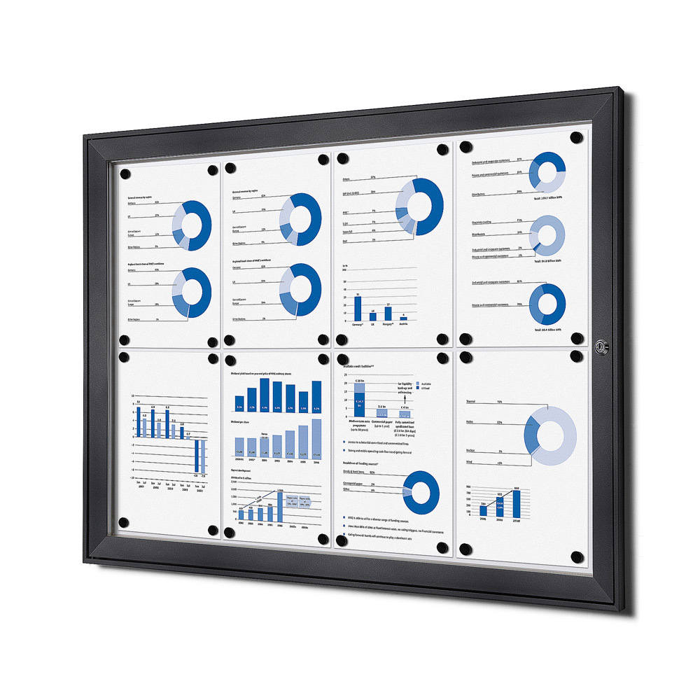 The steel backwall is both writable and magnetic, providing flexible display options. It features a gasket for a secure backwall fit and the acrylic door allows clear visibility of your content. Most sizes come with a single lock, while size 9 x A4 and 12 x A4 are equipped with two locks for enhanced security.