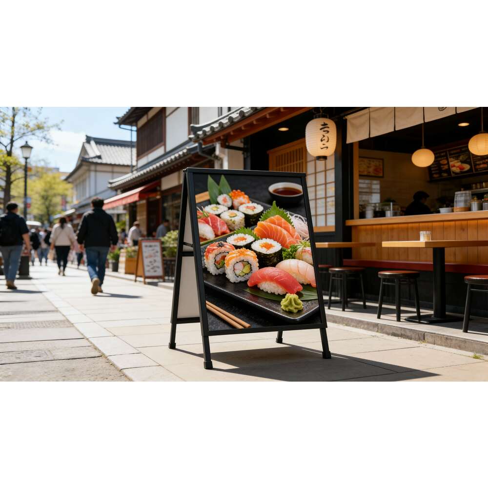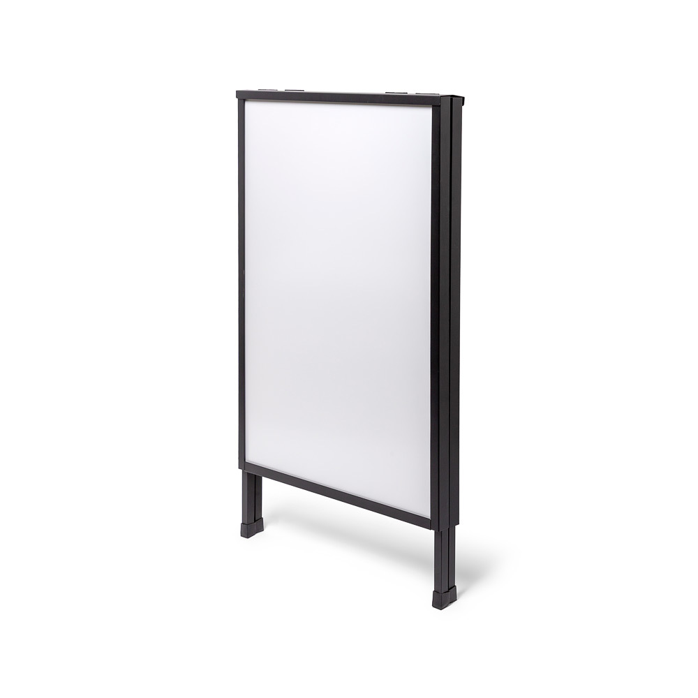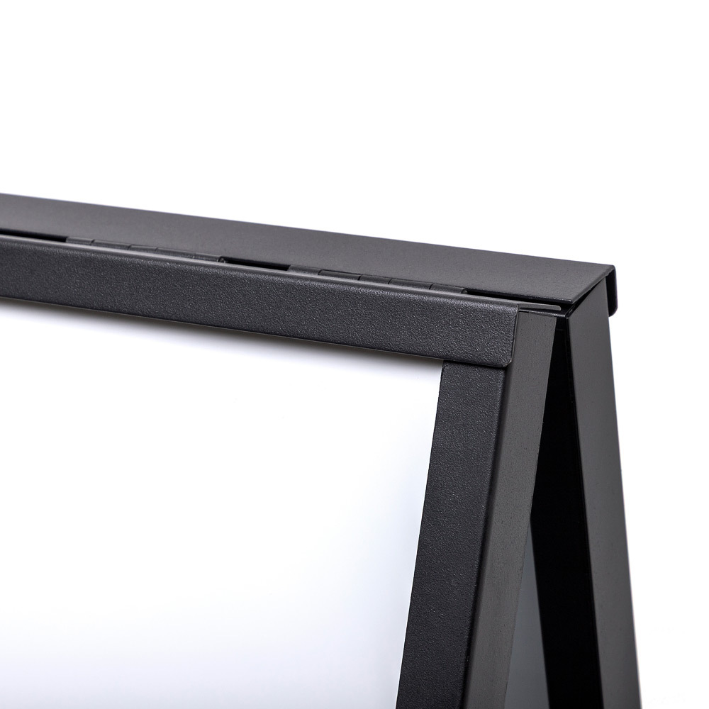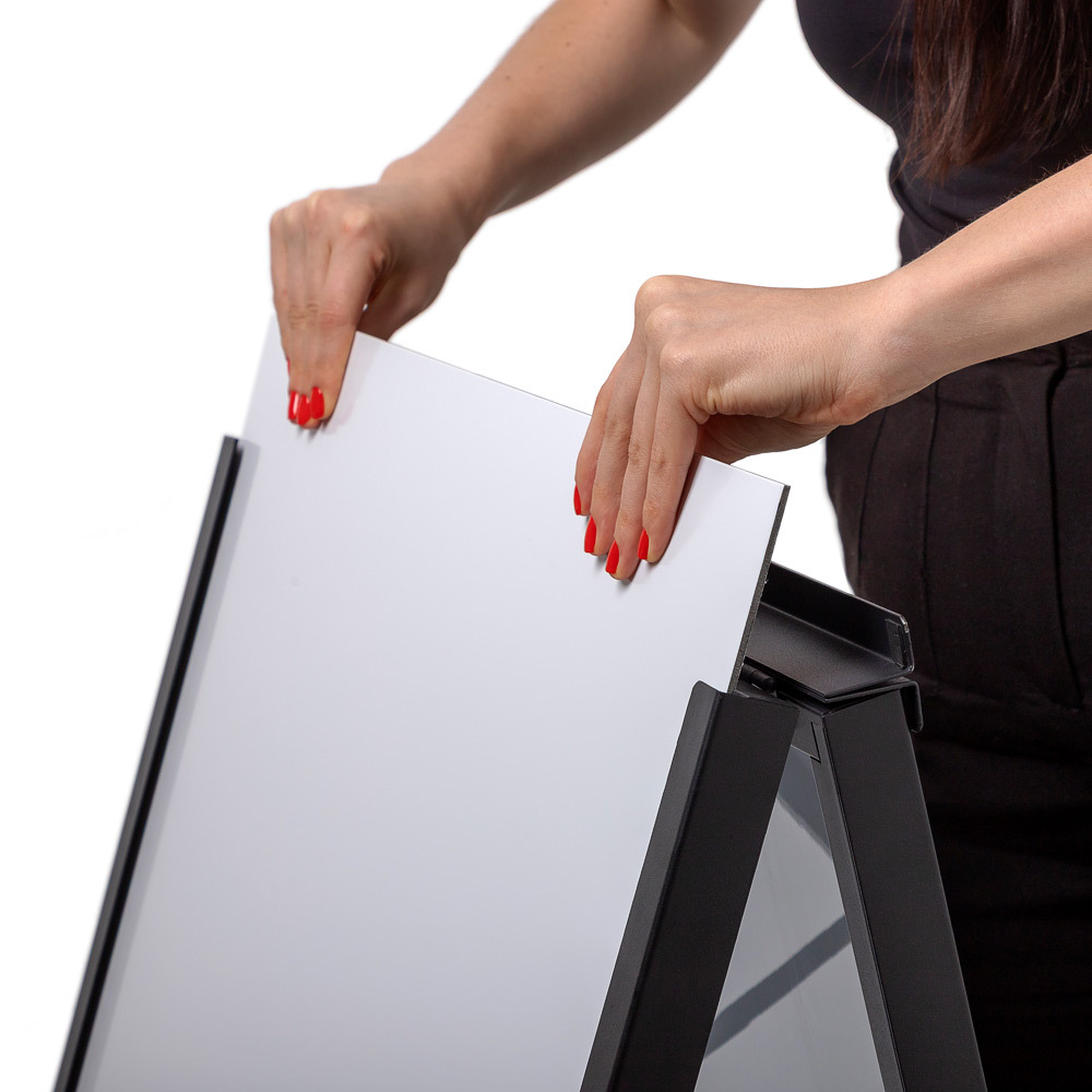 Promote your message or brand with confidence using the weather-resistant A-Board Slide In. Designed for long-term promotions, its sleek black steel frame ensures lasting stability. Suitable for the best-selling A1 size and offering double-sided display. It maximises visibility from every angle! Updating content is a breeze: simply open the frame at the top and slide the board into place . The perfect solution for eye-catching outdoor promotions across retail, hospitality, and urban spaces.