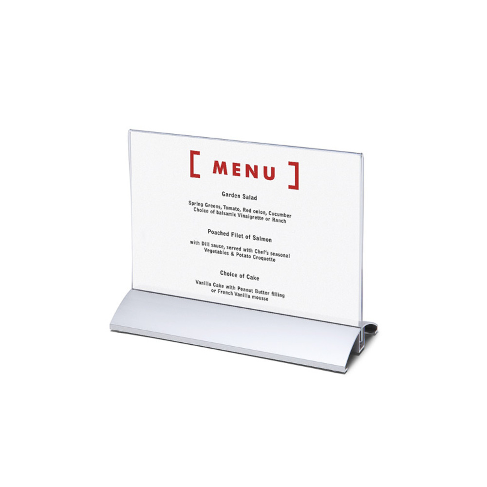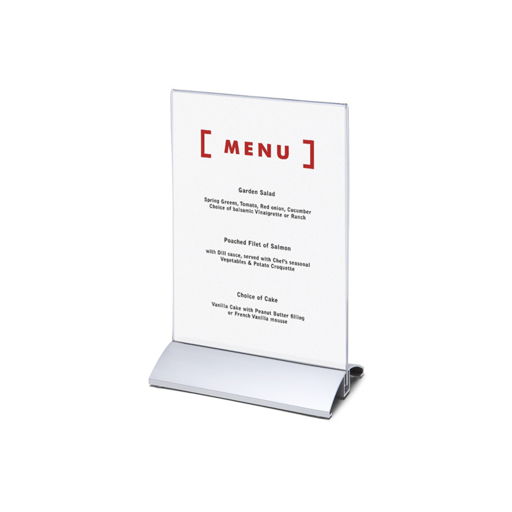 Add flair to your table setting! Whether it's single-sided or double-sided content, the Menu Card Holder handles it all in style. Its silver anodised aluminium convex base adds a modern edge, while the slide-in acrylic holder makes content updates effortless. Available in multiple sizes and orientations, with optional custom branding for a personal touch!