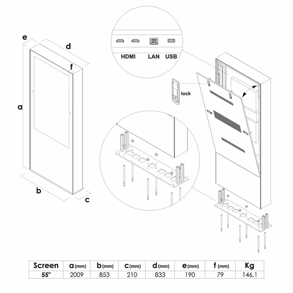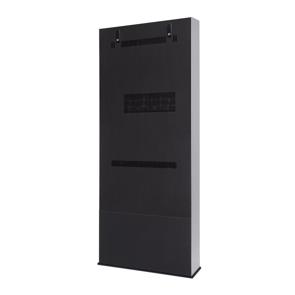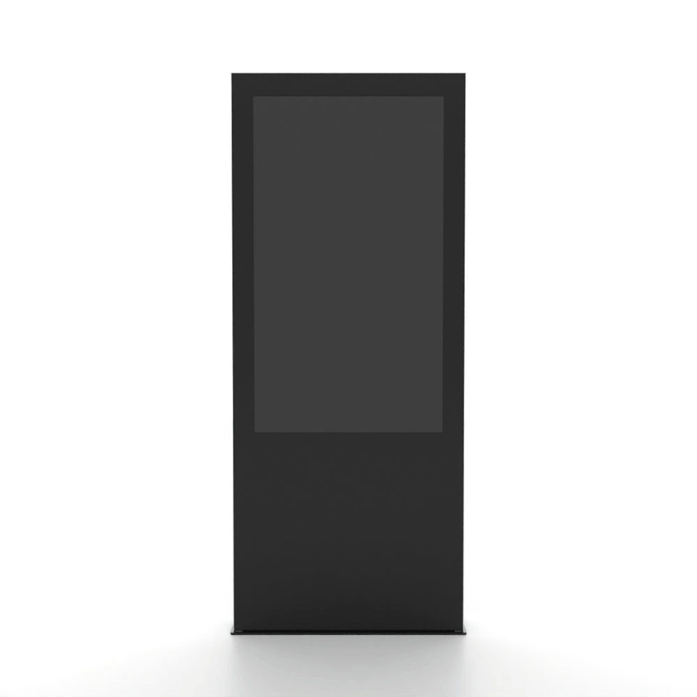 The Outdoor Digital Totem housing is made of highly durable stainless steel panels and aluminium frame. The Outdoor screen has a tempered glass to be protected from vandalism. The screen has a IP56 certificate to protect it from rain and the monitor is covered by IK10 protective front glass panel. The display can operate in temperatures that range from -30°C to 50°C. Mount the Outdoor Digital Totem to the floor with ready fixing holes of 12mm diameter within the base, accessible from inside (screws not included). The professional Samsung screen is only available in 55”. Housing available in the colour black as a standard colour and other colours are possible upon request.