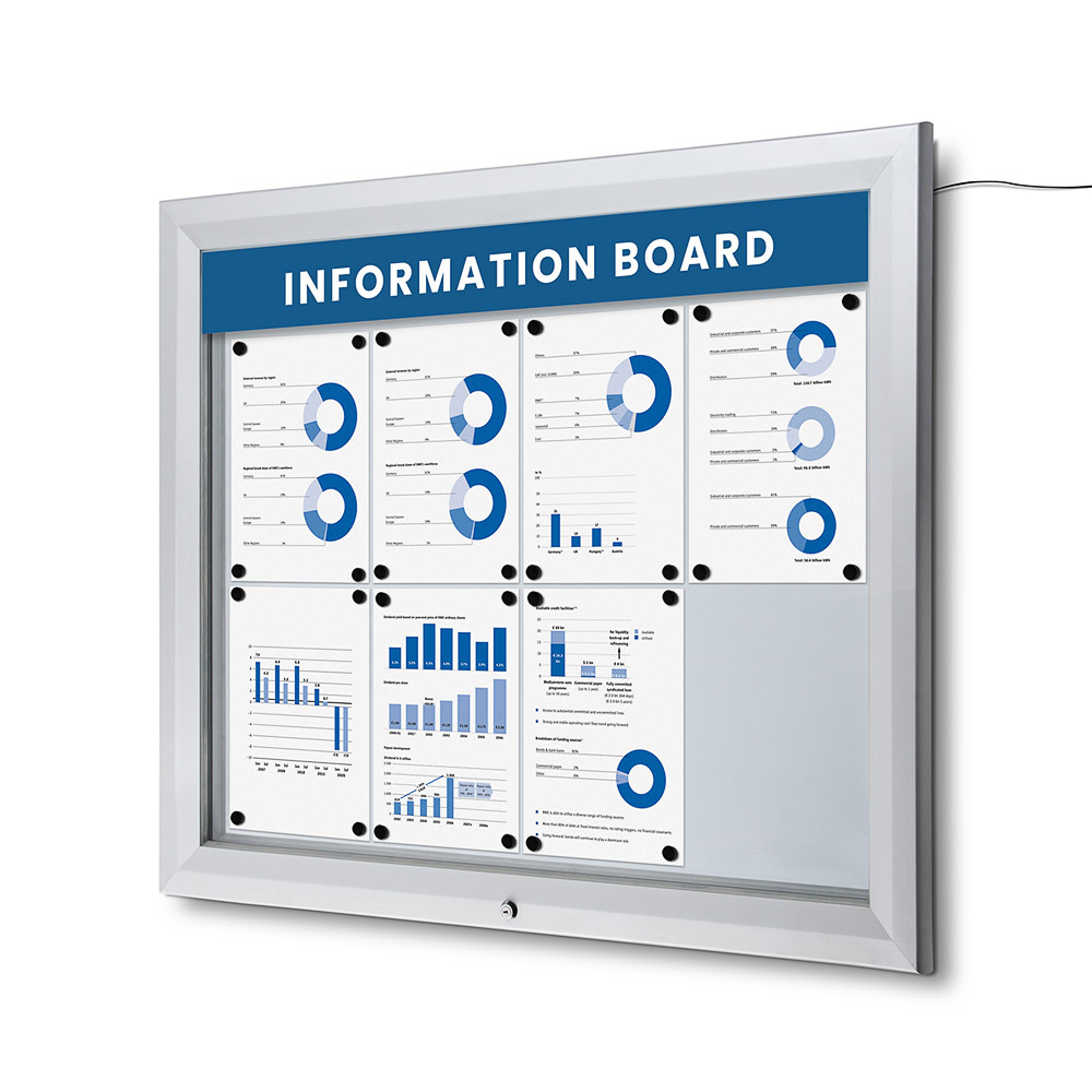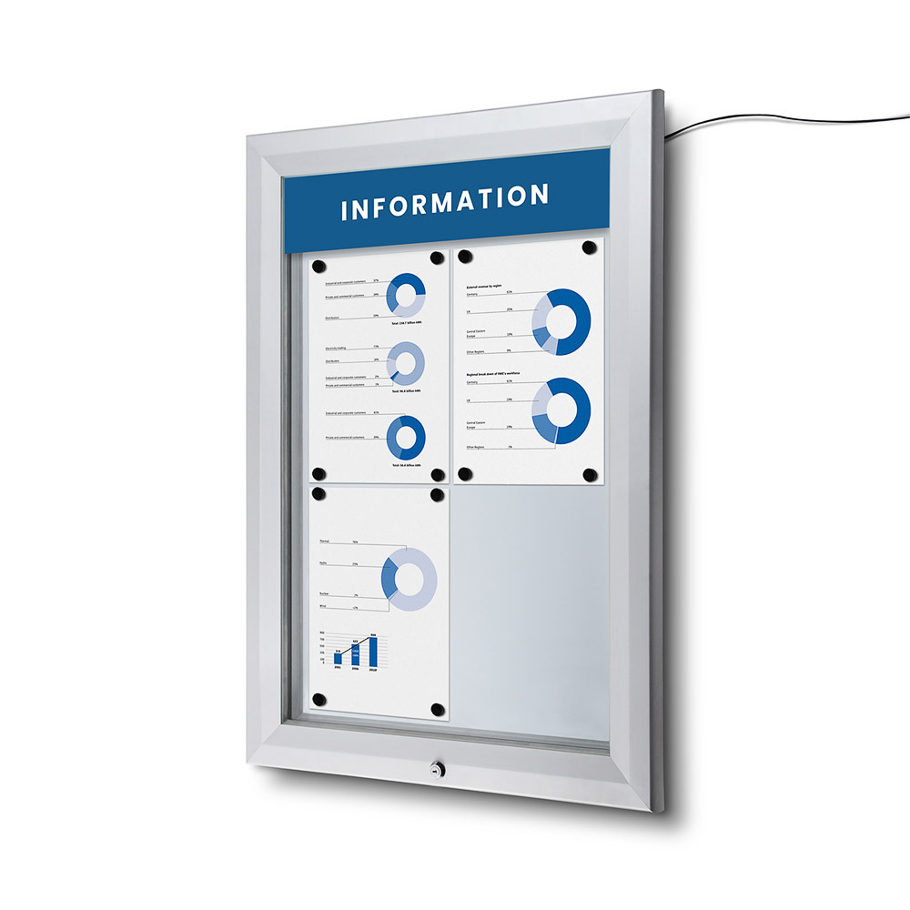 Present your messages or notes securely with our lockable showcase featuring a metal writable backwall. The showcase opens at the bottom and securely closes with a key, ensuring easy access and added security. From size 12x A4, there are gas springs included for holding the front door and for user convenience. Notes or messages can be easily displayed in the showcase by using magnets.