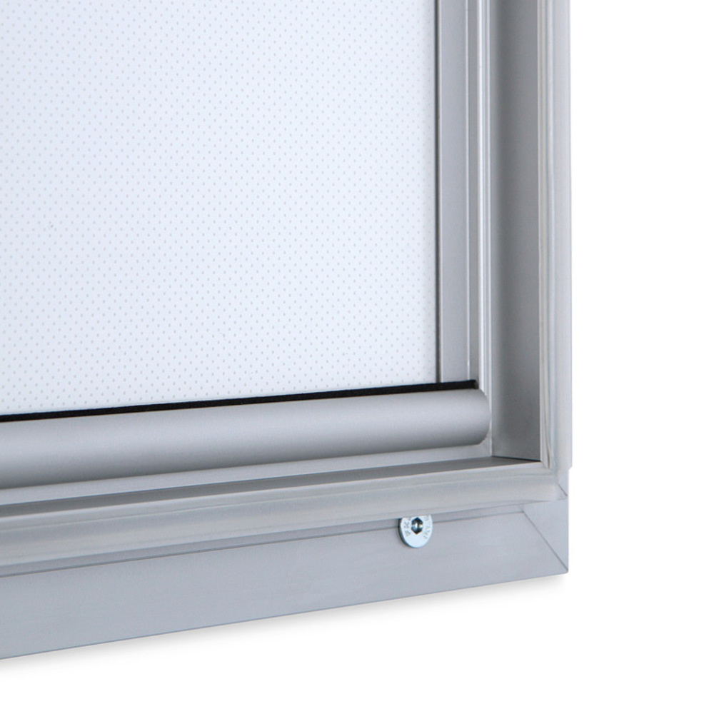 Designed for both durability and functionality, this poster case boasts a robust 6.3 cm profile width. The external depth, which is the distance the poster case extends from the wall, is 6,1 cm. The internal depth to place your poster inside the poster case is 1,4 cm. Excellent visibility and protection of your content is ensured by the 4 mm ESG safety glass door. The included snap system for poster fixing simplifies poster installation. Sizes A1, A0 and 70 x 100 cm come with a single lock, while the larger size 100 x 140 cm includes two locks - the showcase is always delivered with two keys. Mitred corners add a touch of elegance and the B1 fire rating provides additional safety.