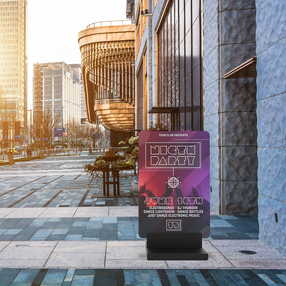 Boasting elegance with its black steel base. The signboard stands out and makes a stylish statement. The non-slip silicone feet ensure stability and making it a reliable and eye-catching addition to your storefront. The Panel Base Steel is suitable for indoor and covered outdoor use.