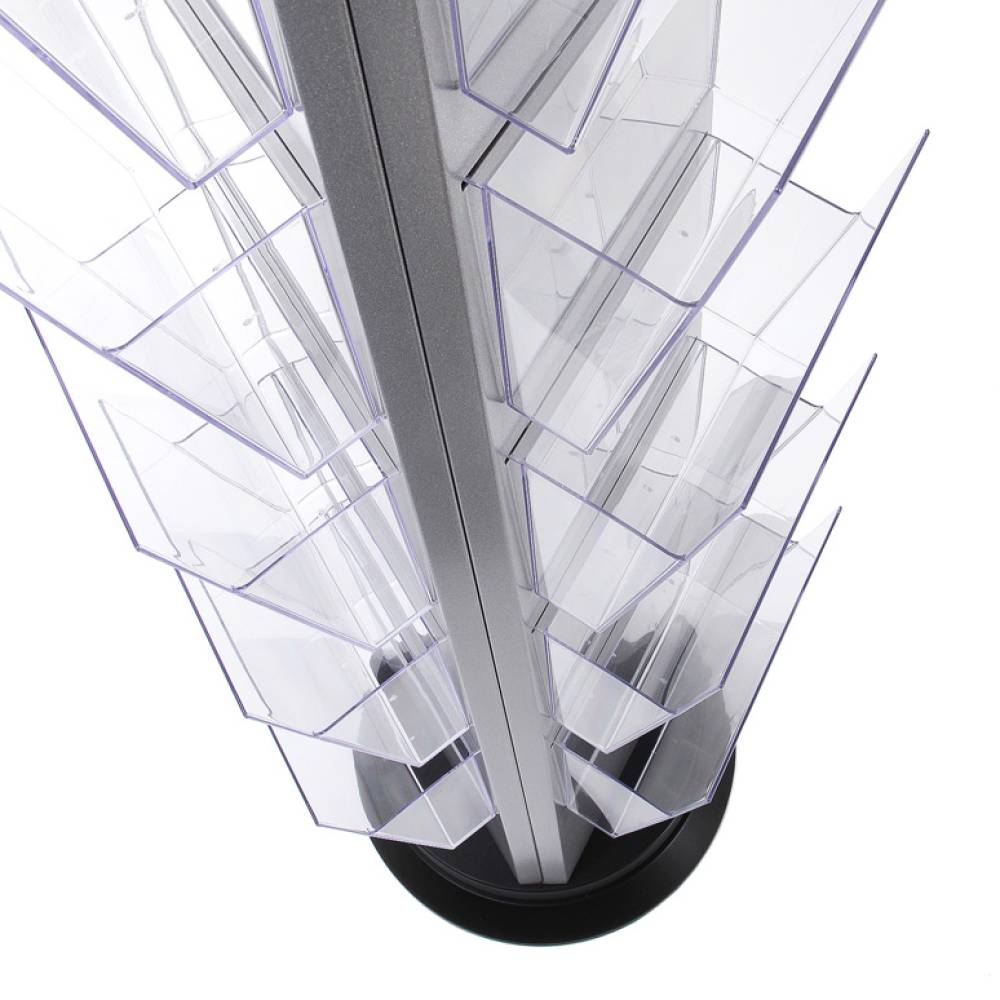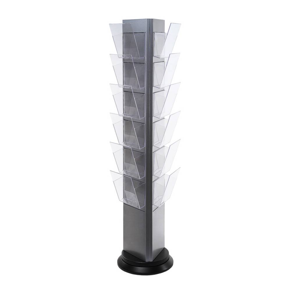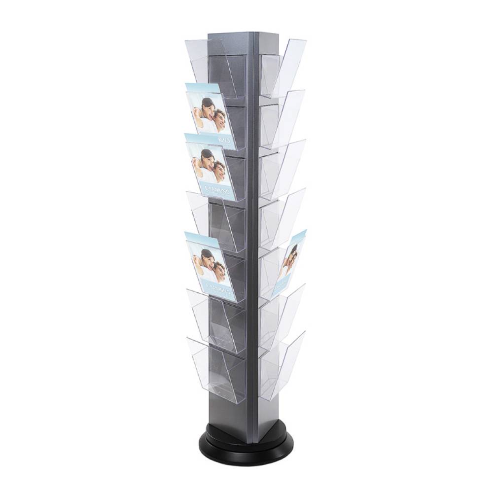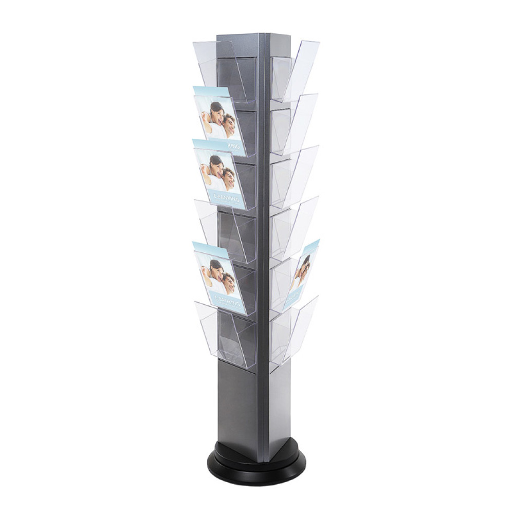 A great brochure stand for offering a wide variety of literature, leaflets or brochures! The Trys Rotation Brochure Stand is a totem stand with a premium look on a rotating base. Both sides of the stand carry pockets, which you can reach by simply turning the totem around. A robust, stylish freestanding brochure stand, with a quality steel construction with a black painted base, that can carry up to 21 A4 pockets. Organise the brochure stand according to your wishes, by ordering the shelves and pockets separately. Just role and read with the Trys Rotating Brochure Stand!