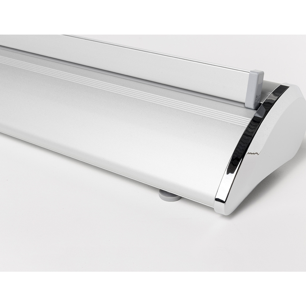 A distinctive look with a high-end appearance; ideal for a presentation in style! The Premium is one of our most luxurious Roll Banners, with an elegant look and chrome teardrop-shaped side caps. Available with silver or black finish. Thanks to the adjustable feet, the Roll Banner Premium stands firm and stable on any surface.