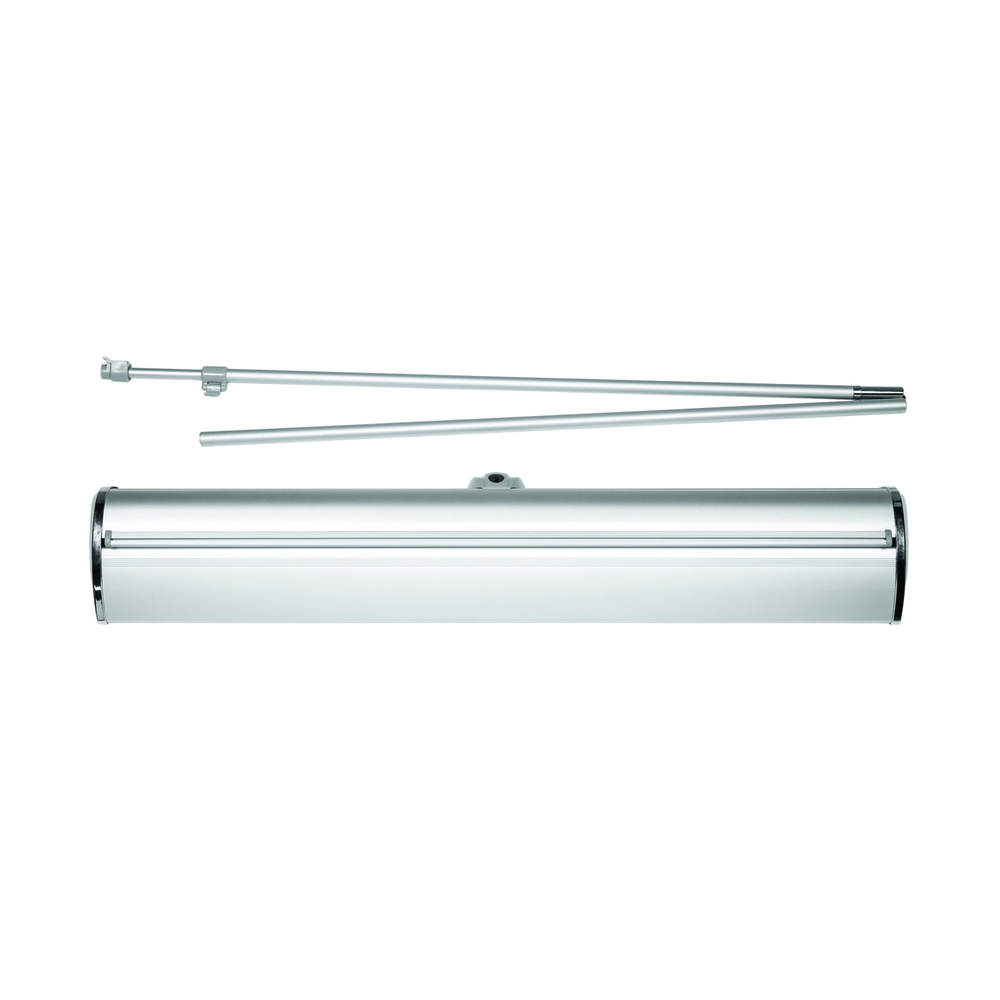 Bring flexibility to your presentations with the Roll-Banner Premium Clamp! Swap graphics in moments using the internal roller with a small gap and an aluminum strip on the back of on your graphic. Footless design and adjustable height up to 220 cm fit any indoor space, while chrome-colored side caps add a touch of elegance. When your next promotion arrives, just roll in a new graphic and shine!