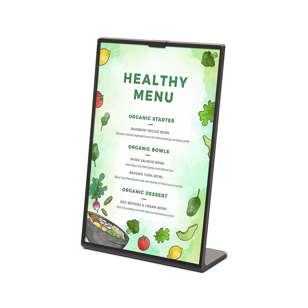Make menu updates effortless with the Scritto® Menu L Stand! This durable holder in L shape provides a sleek stage for your messages. Classic black design adds a professional touch to any setting. Perfect for restaurants, bars, offices, or receptions. Switch content in seconds and keep your tables looking sharp!