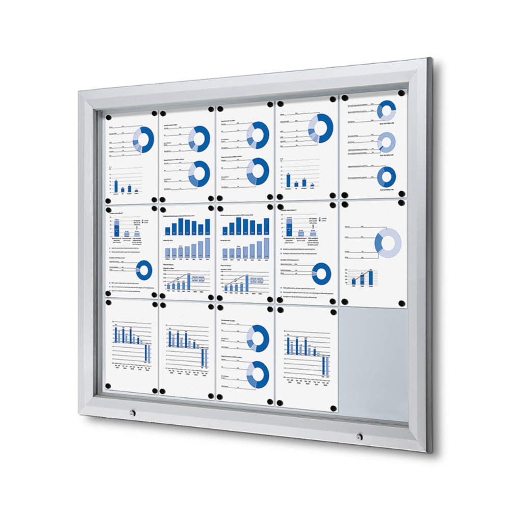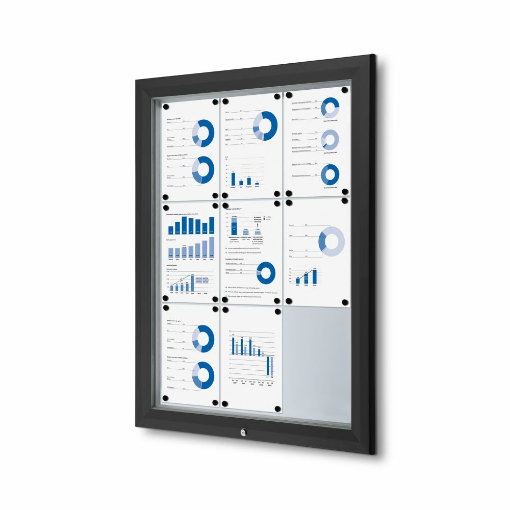 Present your messages or notes securely with our lockable showcase featuring a metal writable backwall. The showcase opens at the bottom and securely closes with a key, ensuring easy access and added security. From size 12x A4, there are gas springs included for holding the front door and for user convenience. Notes or messages can be easily displayed in the showcase by using magnets. The showcase is B1 fire rated, which makes it a safe and ideal showcase to use.