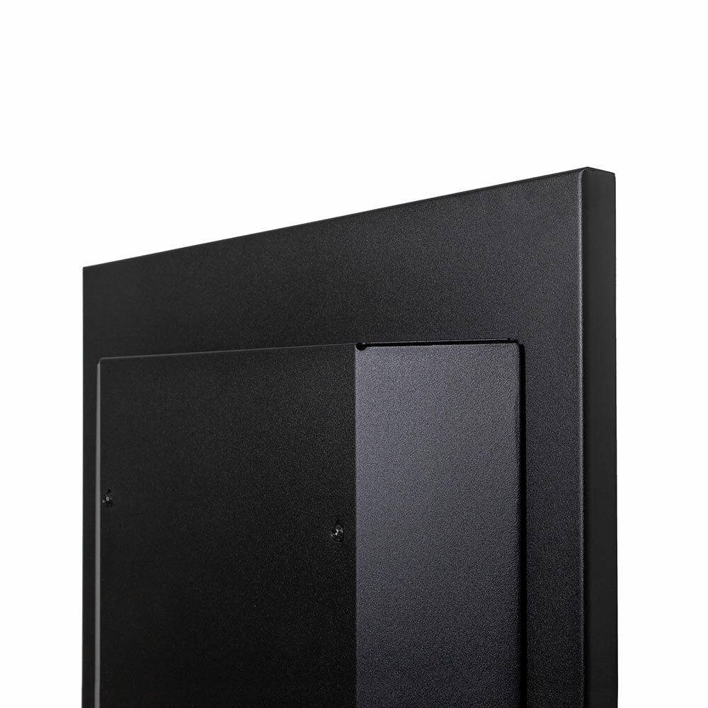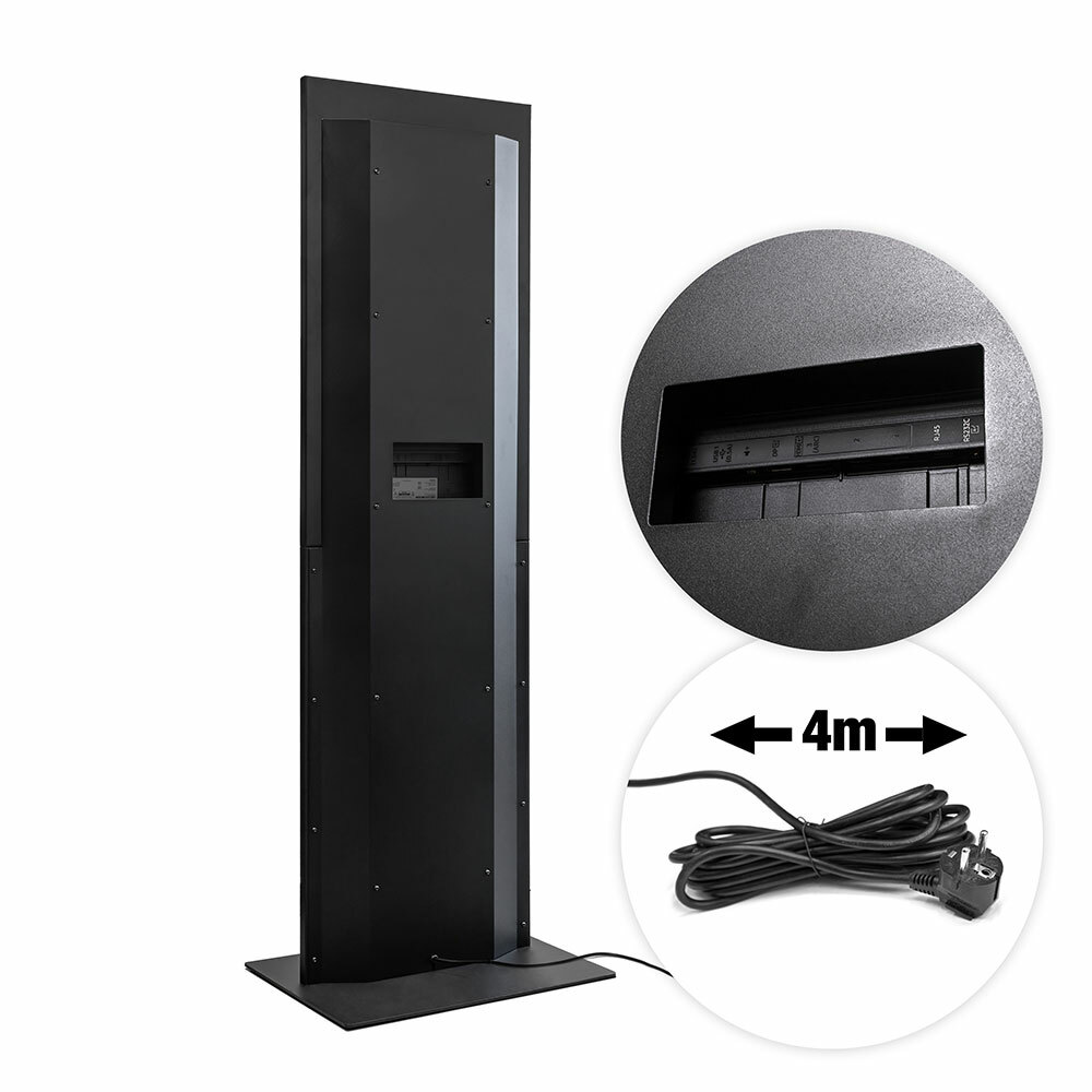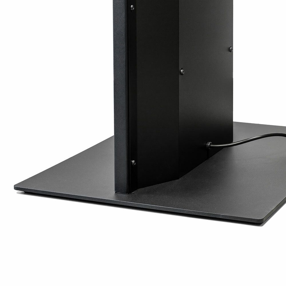 The totem is available with 43” screen. The housing is standard in black. Other RAL colours only upon request. The 6 mm heavy steel plate base has 7,5 mm squared rubber feet, designed to ensure good stability and sleek design.