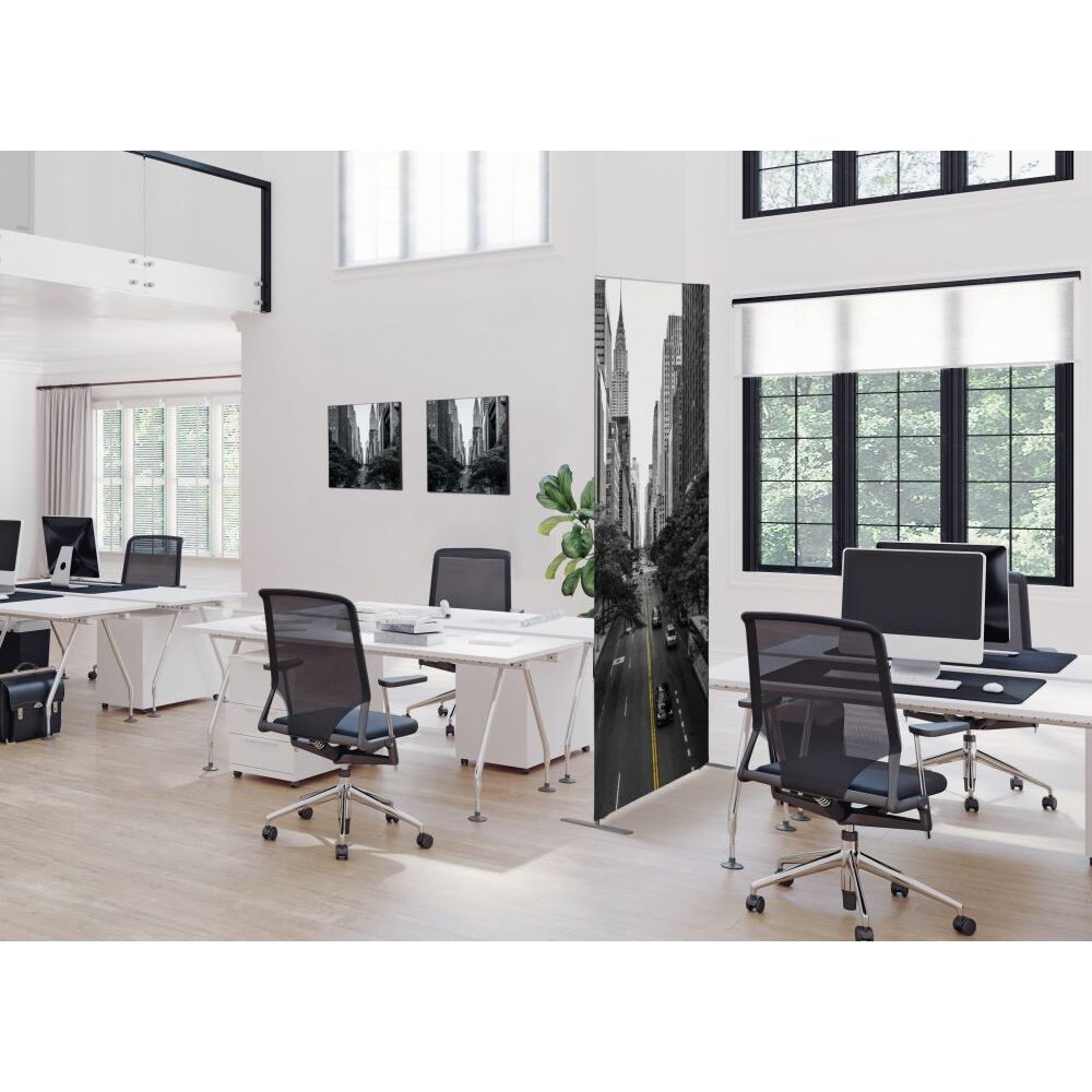 A complete set of a Textile Frame Elegant Black with a standard print design. The Textile Frame Elegant Black is perfect for decorating walls in offices or public spaces, to add more ambience. A stylish and unique black thin profile of 22 mm, holding a Silicone Edge Graphic. The Soft Knit graphic material is B1 fire rated, which makes it ideal and safe material to use in public spaces, offices or as interieur decoration. The Textile Frame Elegant Black with standard print design is delivered assembled, which means that you are ready to install the hanging solution in just a second. Use the pre-drilled fixing point and you can hang your Textile Frame Elegant Black where you want it to be. Choose the print design for your occasion.