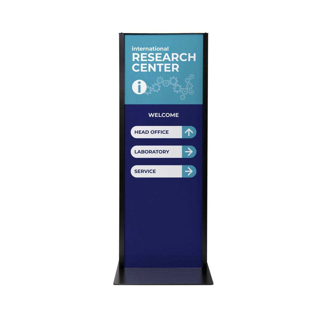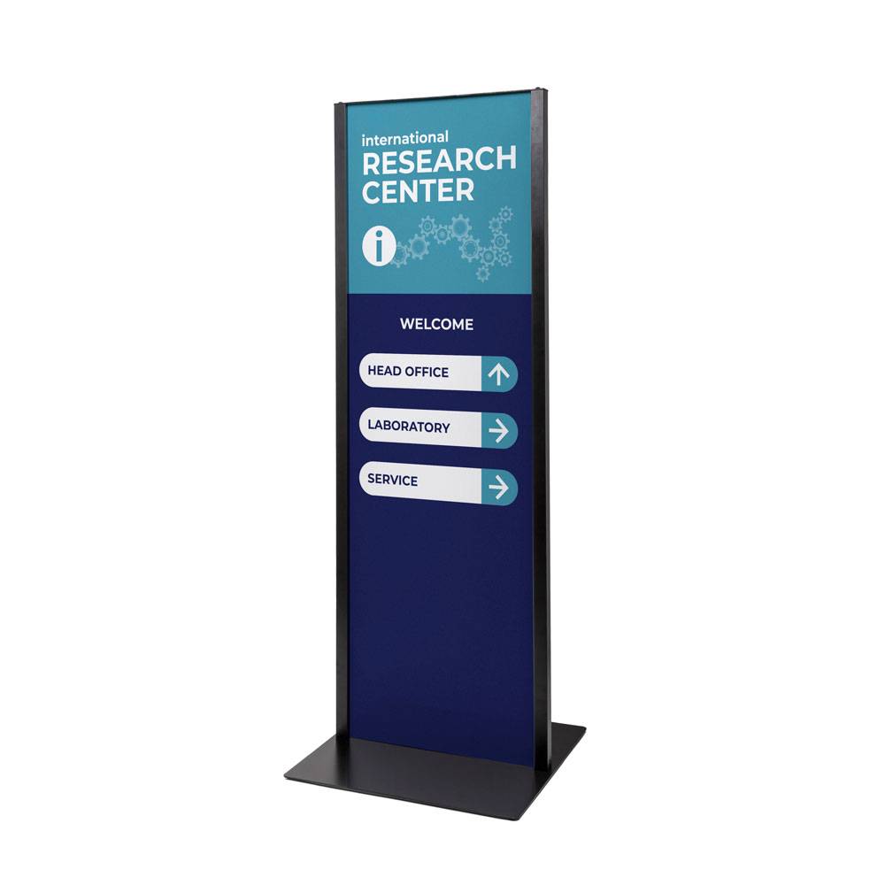 Create an effective wayfinding system and provide information easily with the Totem Panel+. Its slim 25 mm frame and sturdy steel base provide the perfect stage for your message. The frame design provides convenient access from the top, making content changes quick and effortless. Printed on FOREX® board, manufactured in Switzerland, it stays sharp and vibrant, even with daily use. Display your message on both sides for maximum visibility, or leave the back empty for a clean, minimalist look. Either way, you make an impact!
