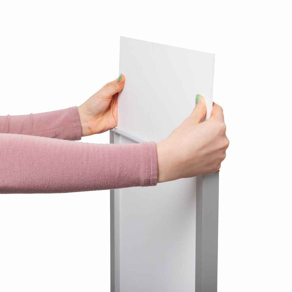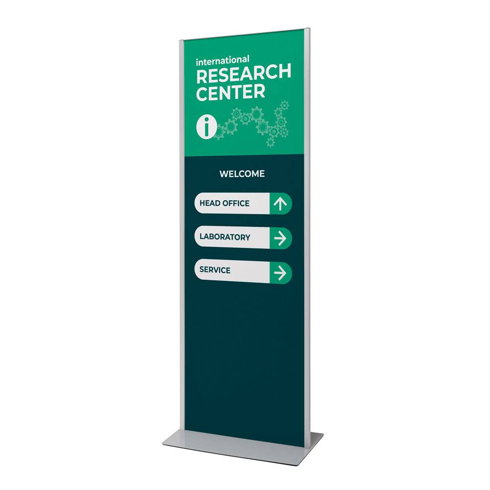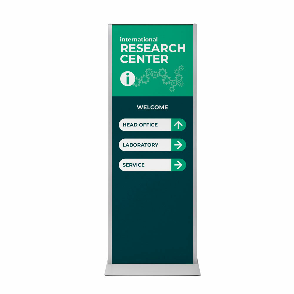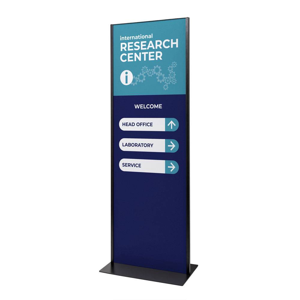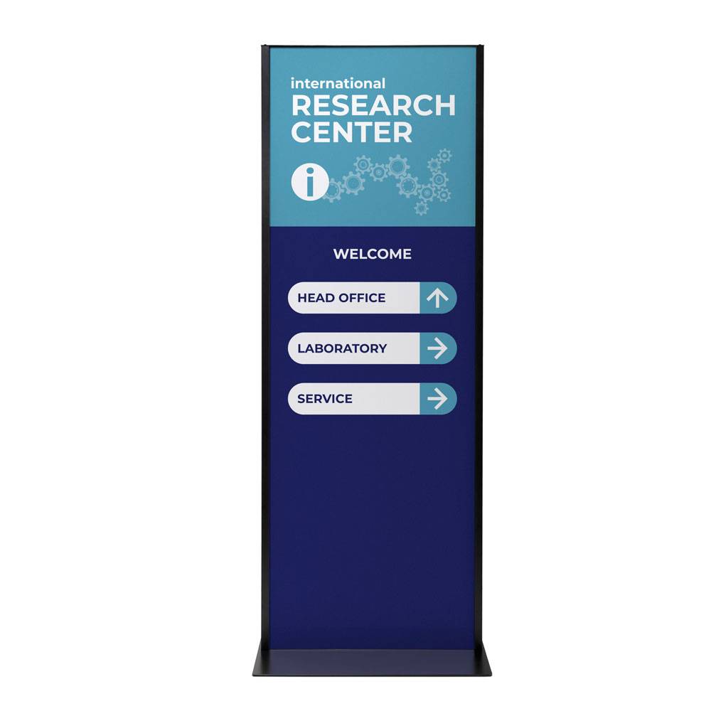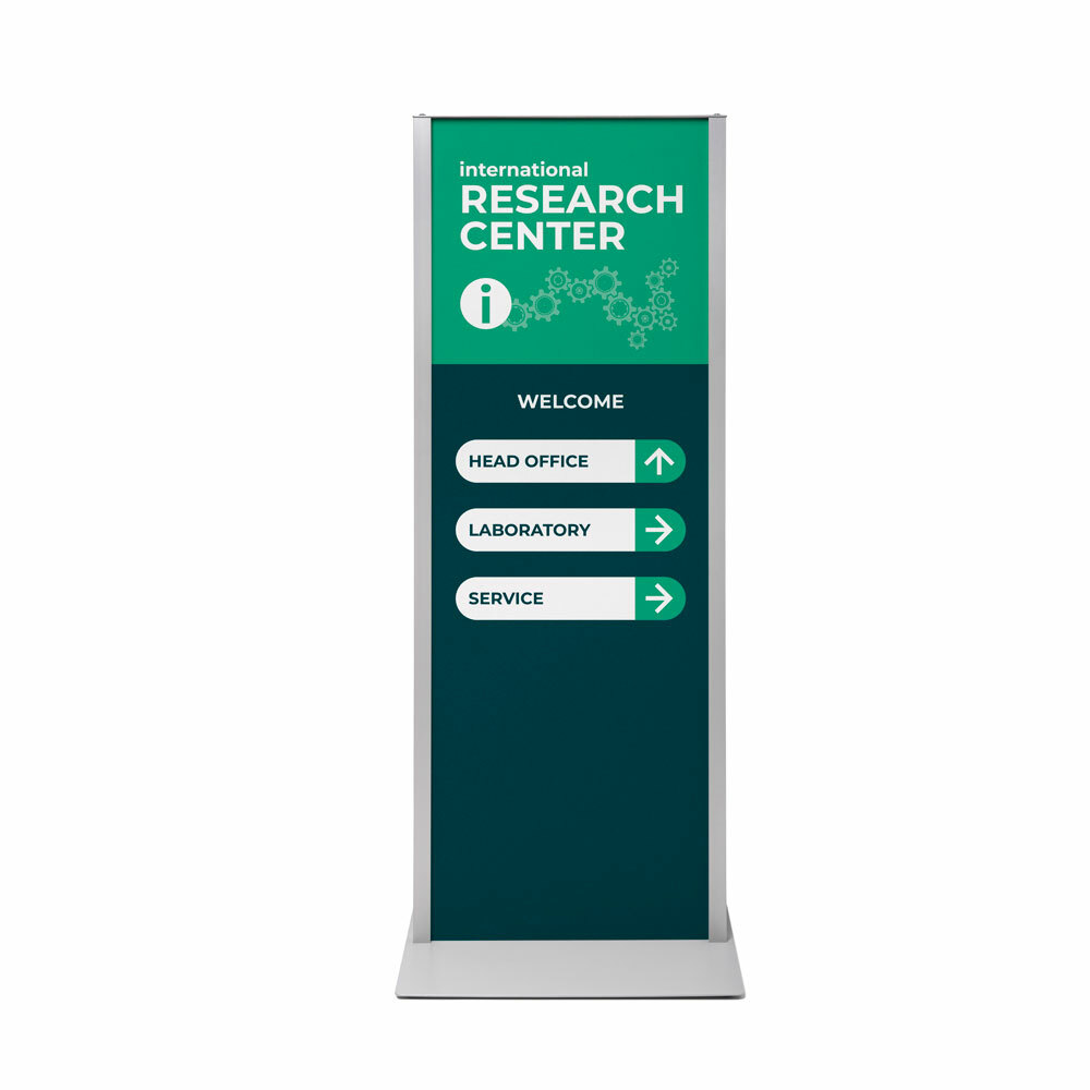 Create an effective wayfinding system and provide information easily with the Totem Panel+. Its slim 25 mm frame and sturdy steel base provide the perfect stage for your message. The frame design provides convenient access from the top, making content changes quick and effortless. Printed on FOREX® board, manufactured in Switzerland, it stays sharp and vibrant, even with daily use. Display your message on both sides for maximum visibility, or leave the back empty for a clean, minimalist look. Either way, you make an impact!