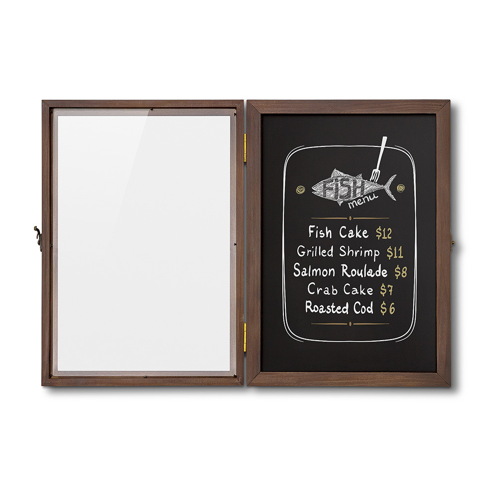 Bring vintage charm to your space! The Wooden Showcase gives you full creative freedom with a wooden frame and black back panel. Easily stick your daily offers with magnets or write with liquid chalkmarkers. The protective glass door with a secure latch keeps your messages safe, making it perfect for hospitality settings or even home use.