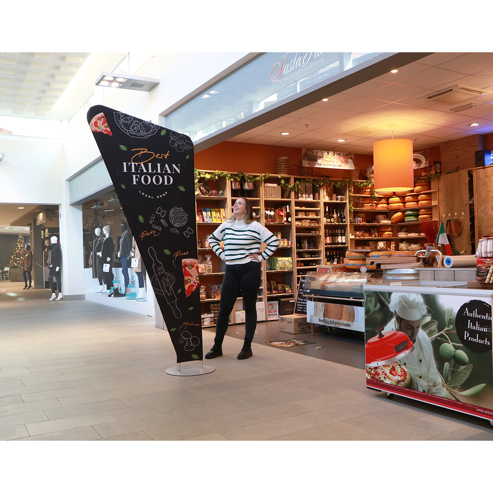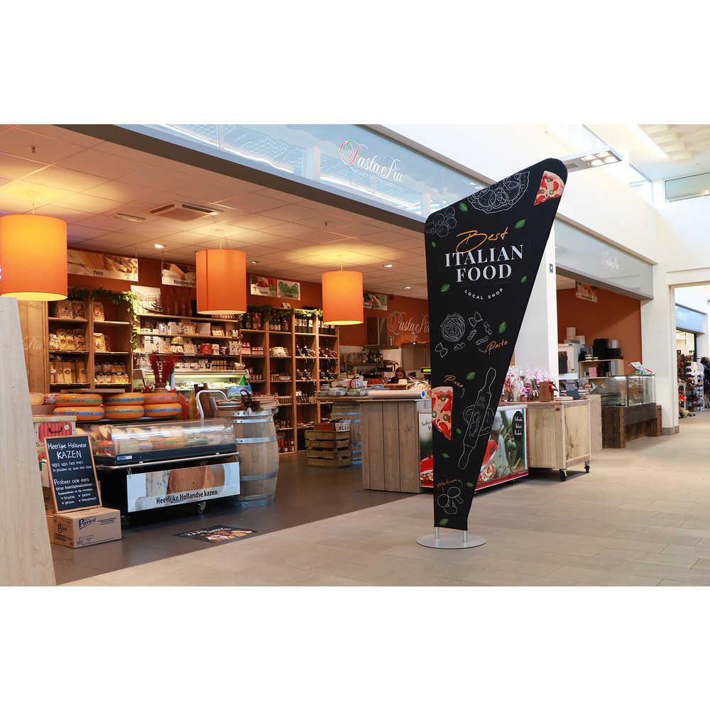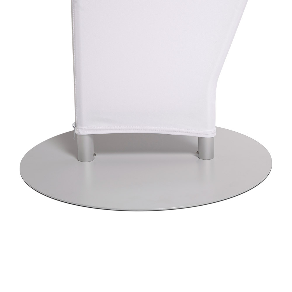 The Zipper-Banner Triangle gives a fresh twist to traditional flags and banners. Standing nearly 2.6 m tall, it commands attention in shopping malls, exhibitions, schools, and airports. Setup is fast and effortless: click-in the numbered aluminium tubes, slide the graphic over the frame, and secure it with the zipper. Choose a single-sided or double-sided graphic — either way, you’ll make a lasting impression!